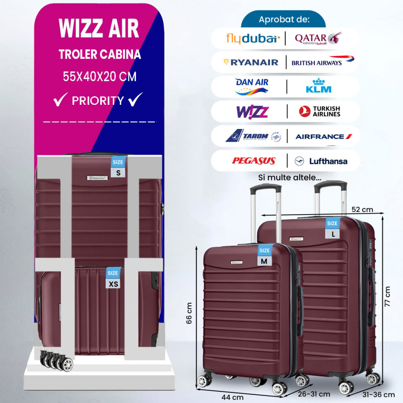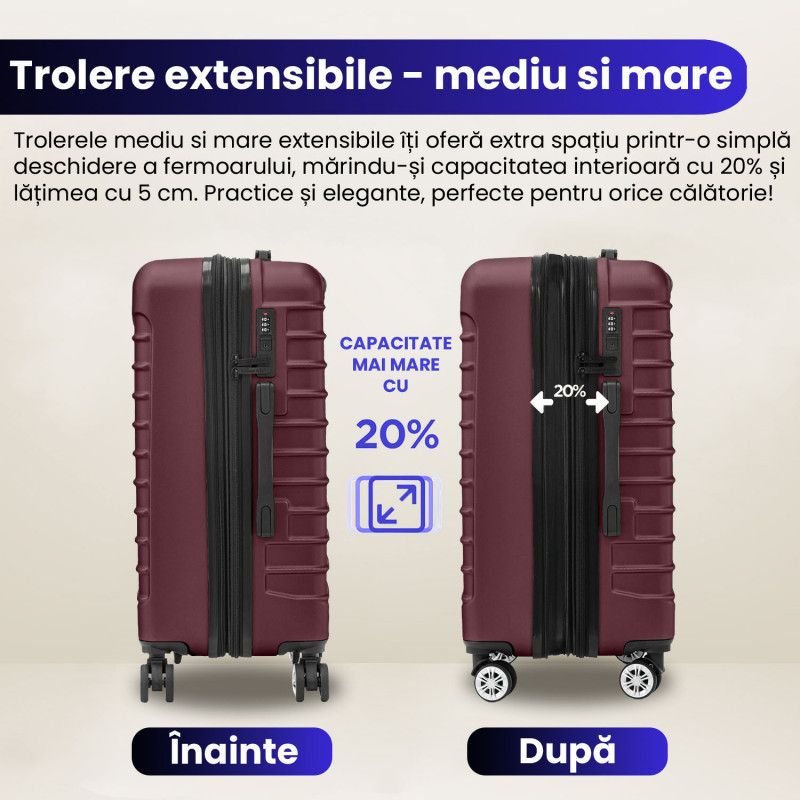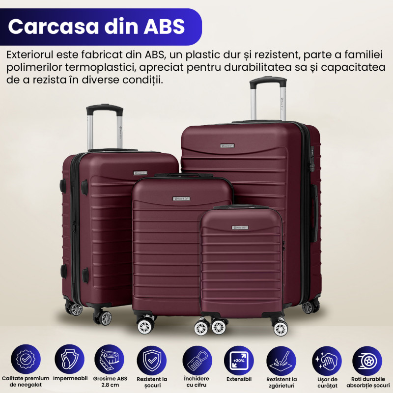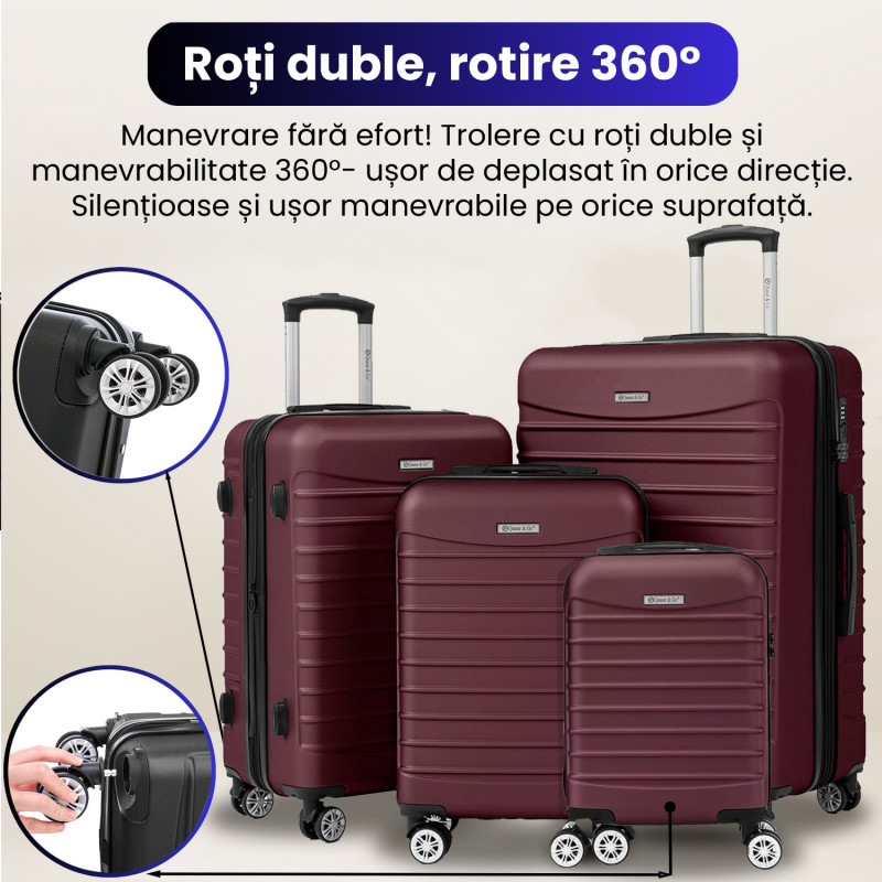 Perfecte pentru calatorii cu avionul, setul de 4 trolere cu dimensiunile de 40 x 30 x 20 cm (cu roti detasabile), 55 x 36 x 20 cm, 66 x 41 x 26-31 cm si 77 x 49 x 31-36 cm dispune de 4 roti duble cu rotatie de 360° pentru manevrabilitate usoara. Fabricate din ABS rezistent, au manere telescopice, cifru si fermoar antifurt pentru siguranta.