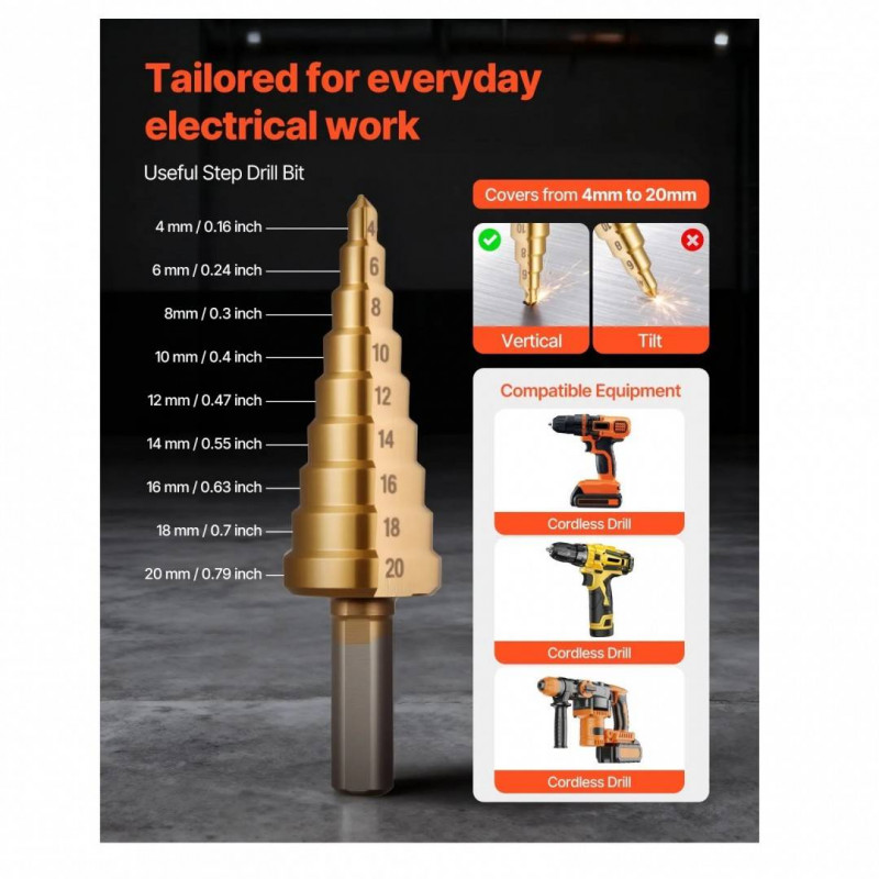 mm), o cheie, o cheie tubulara, o burghiu in trepte si o cutie de depozitare