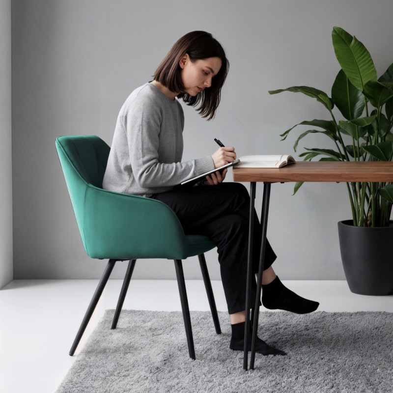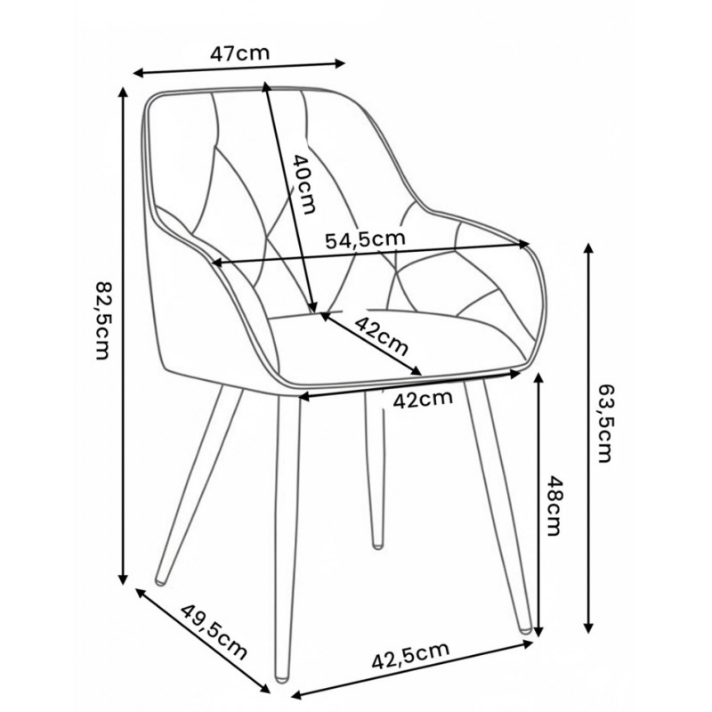 Scurta descriere: Setul DIAMANTE cu 6 scaune tapitate in velur aduce eleganta si confort in dining, living sau spatii de birou. Tapiteria moale si matlasata ofera un plus de rafinament, iar picioarele metalice negre asigura stabilitate si un aspect modern. Designul versatil permite integrarea usoara atat in interioare contemporane, cat si clasice.