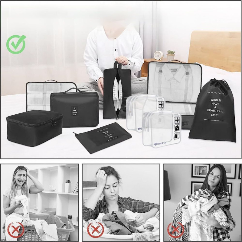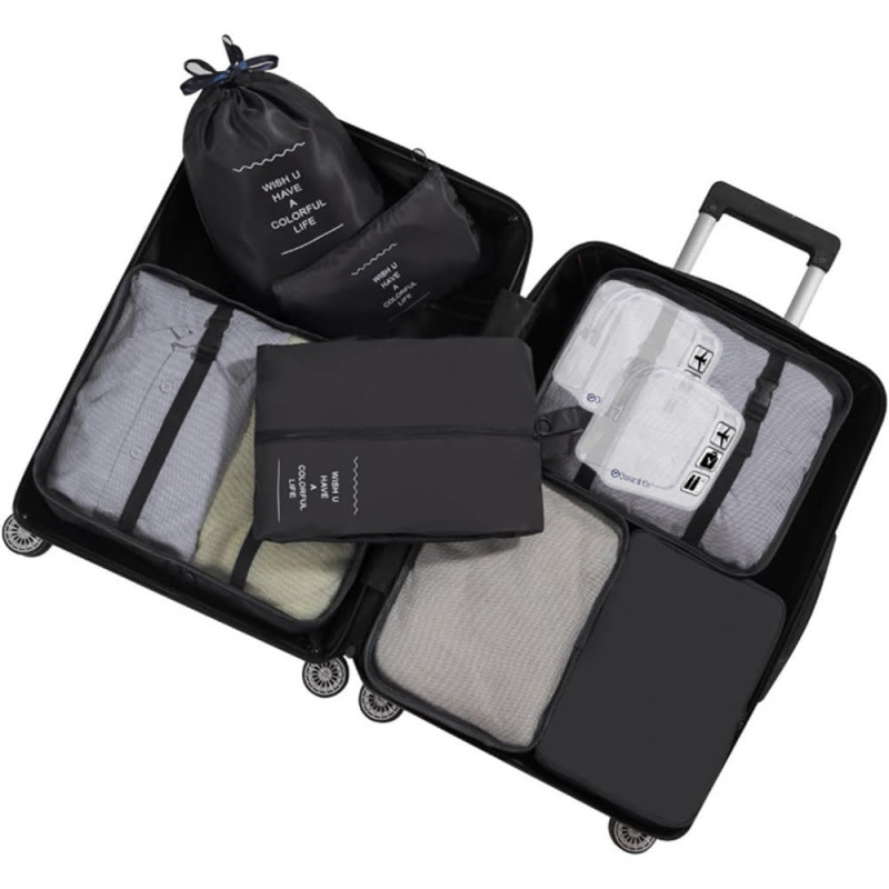 | Continut pachet | 2 x Gentute cosmetice calatorie, 8 x Organizatoare voiaj, Set huse bagaj/Husa pentru bagaje/Organizator bagaj/Husa de protectie pentru bagaj/Huse pentru depozitare bagaje/Husa pentru ordonare bagaje/Husa de calatorie pentru bagaj |