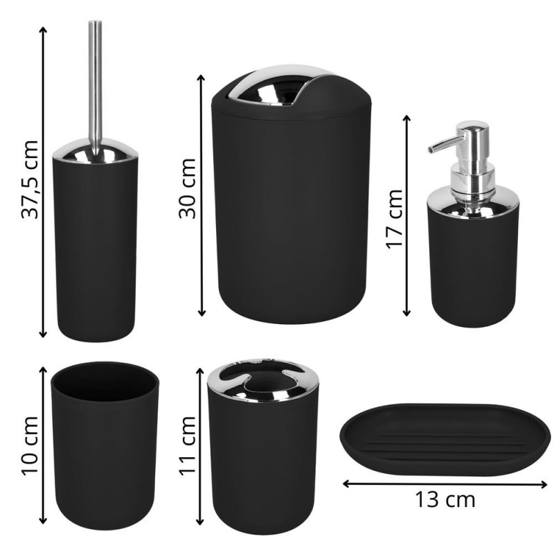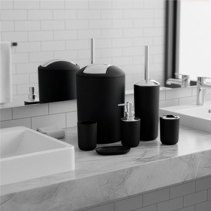 Scurta descriere: Set complet de accesorii pentru baie, realizat din plastic rezistent, cu finisaj mat si lucios. Include toate elementele esentiale pentru organizare si igiena zilnica. Designul modern permite integrarea usoara in bai contemporane.