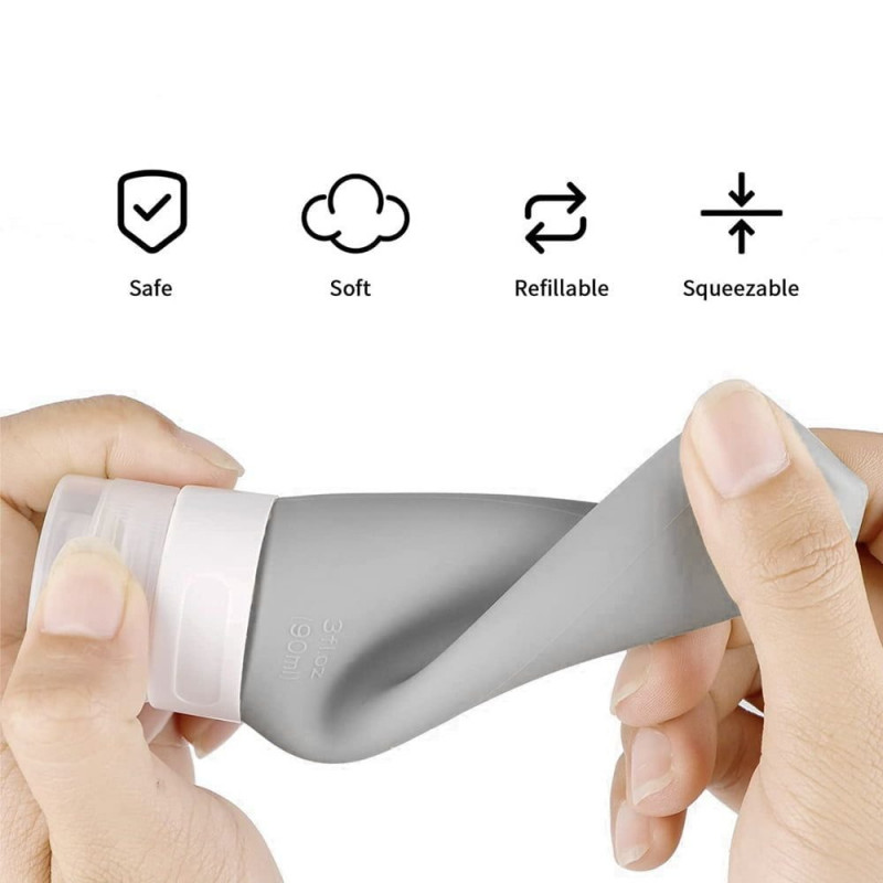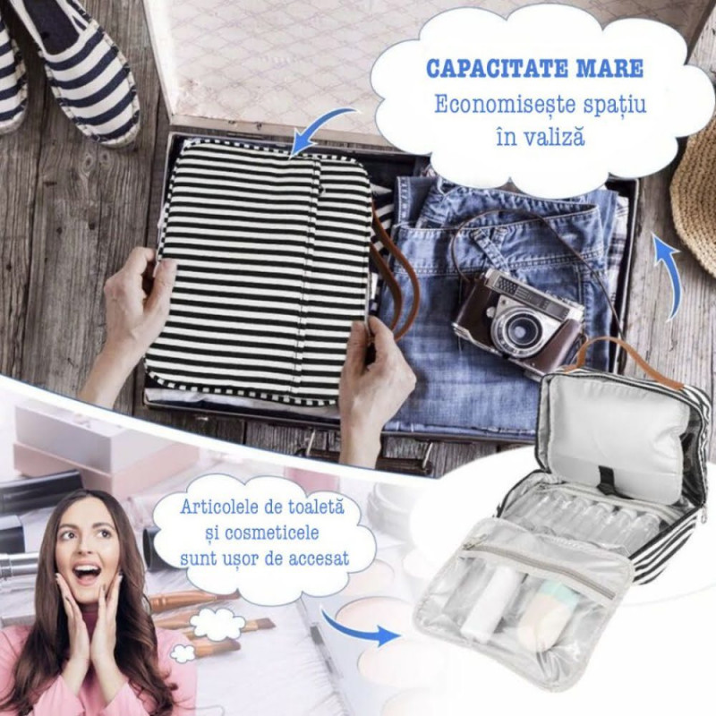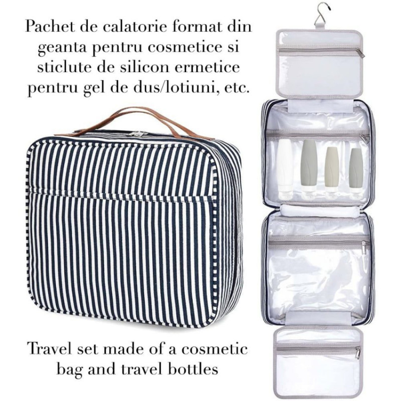 Borseta de voiaj pentru cosmetice. Fiti siguri ca veti atrage admiratia si zambetele celor care o vor privi. Aceasta borseta este ideala pentru pastrarea cosmeticelor atunci cand mergeti intr-o calatorie. Este conceputa pentru pastrarea si transportul, in deplina siguranta, a produselor cosmetice. Recipientele din silicon sunt cele mai practice accesorii pentru calatorie, in special daca alegi sa calatoresti fara bagaj de cala. Ia cu tine produsele cosmetice preferate (sapun, crema, sampon, balsam etc.) in recipiente de 60 si 90 ml, fabricate dintr-un silicon foarte fin si o forma care te va ajuta sa folosesti continutul pana la ultima picatura.