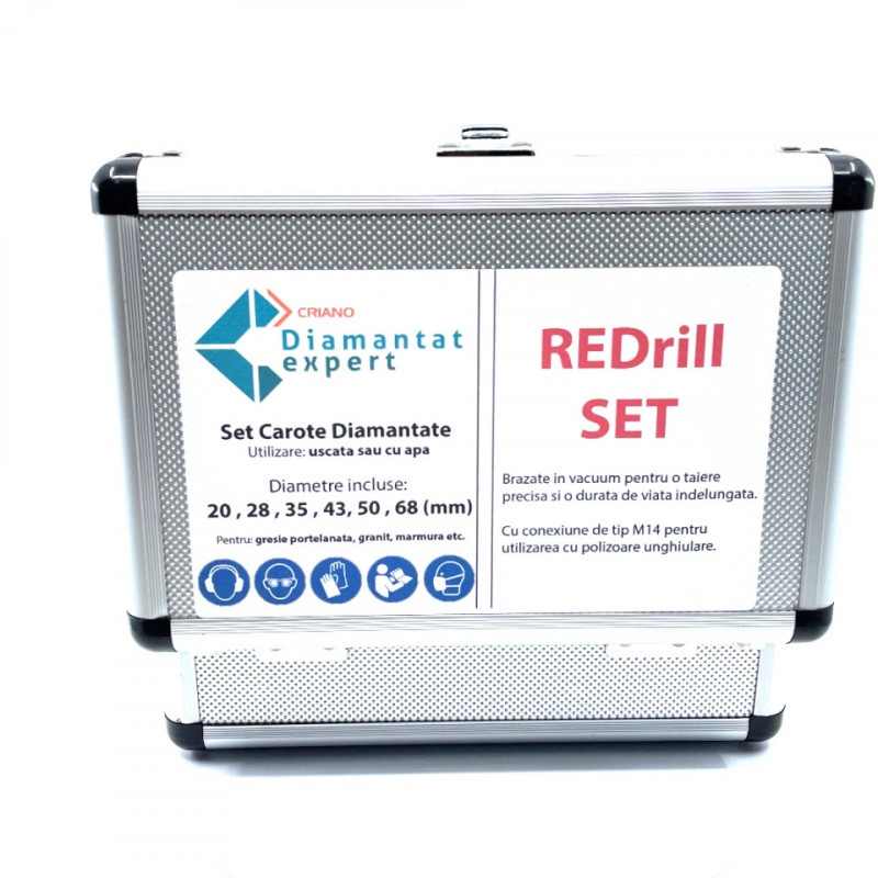 Setul contine carotele diamantate Redrill cu diametrele: 20, 28, 35, 43, 50 si 68mm (cu valiza de transport)