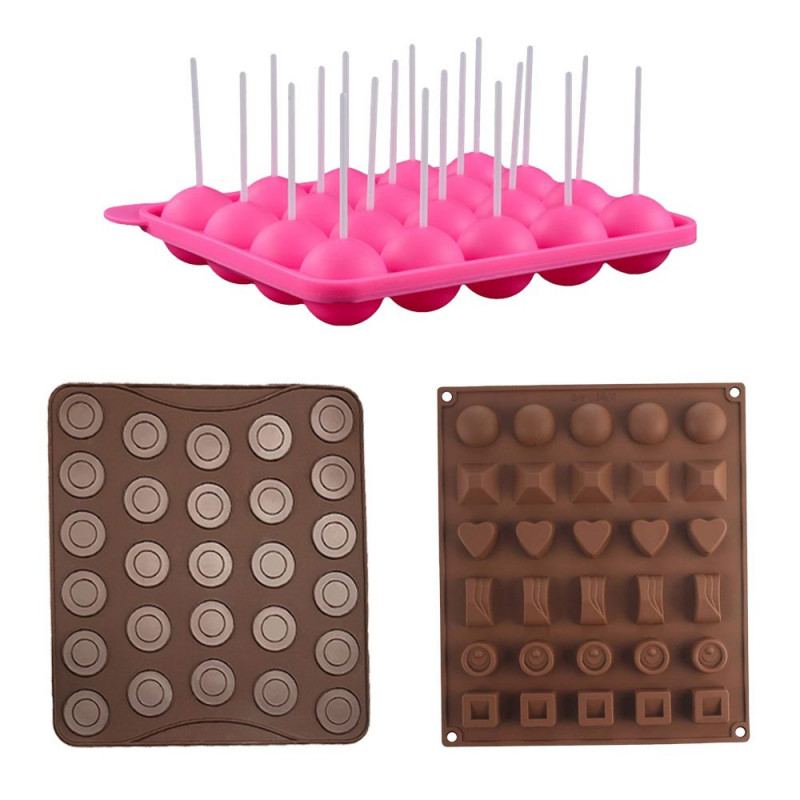 | Continut pachet | 1 x matrita 30 forme bomboane, 1 x tava cu 20 forme acadele cu betisoare, Tava de copt macarons si fursecuri cu 27 forme |