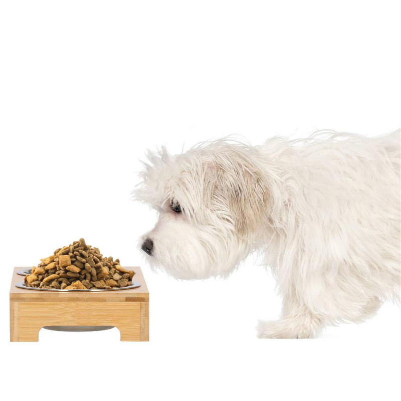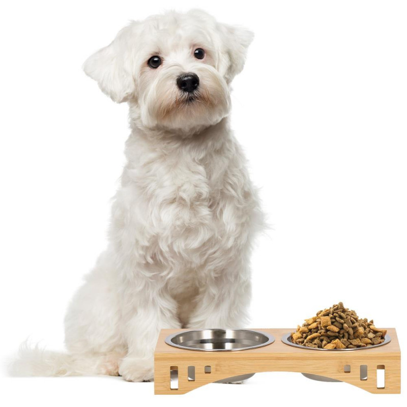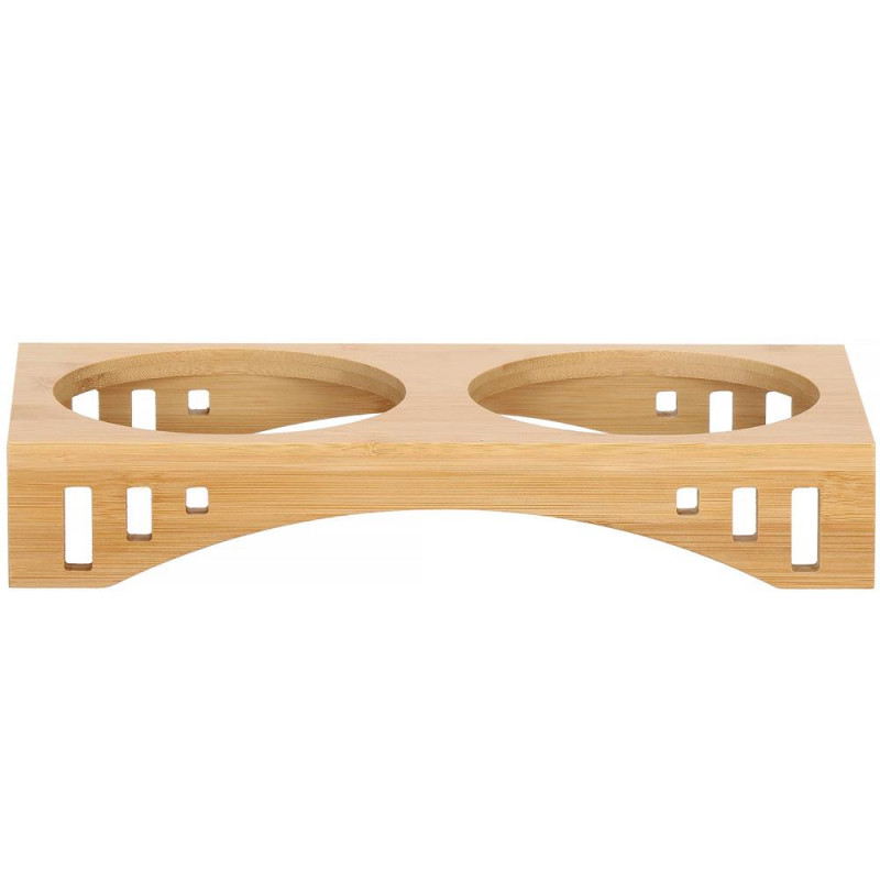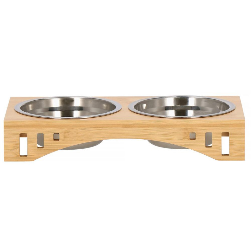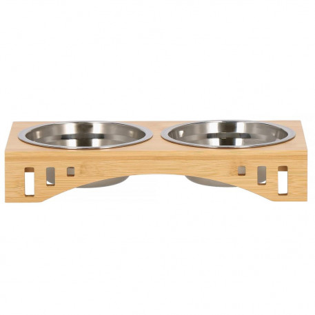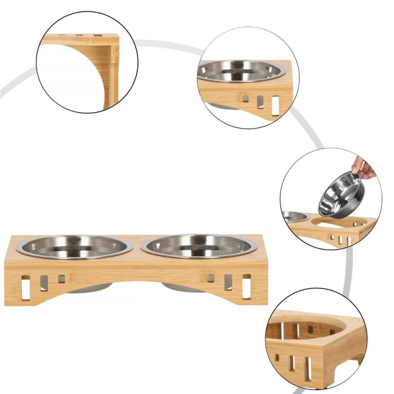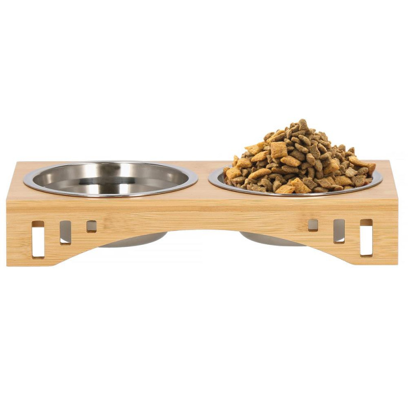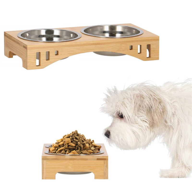 Inaltimea bolului: 5 cm Un castron pentru pisica sau caine este un element indispensabil pentru fiecare animal de companie. Bolurile sunt fabricate din otel inoxidabil, care nu este toxic. Farfuriile fabricate din acesta sunt foarte usor de pastrat curate. Pot fi folosite cu succes pentru hrana uscata si umeda sau apa. O pisica ratacind in spatele unui bol in timp ce mananca este o priveliste pe care o cunoaste toata lumea. Bolul dublu este mai greu si mai mare decat bolurile simple, iar acest lucru va asigura ca ramane la locul lui. Animalul dvs. de companie va manca in liniste. In plus, va preveni zgarieturile nedorite pe podea si pe mobilierul din apropiere. Suportul din bambus combinat cu bolurile metalice au un aspect foarte estetic si se potriveste in orice interior. Puteti extrage liber bolurile din baza pentru a le umple sau spala,