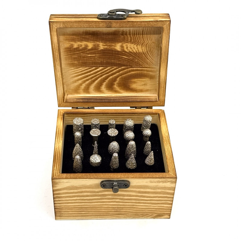 Frezele diamantate lipite în vid, set de 20 buc, ambalare în cutie din lemn, pentru granit, piatră, fontă, țevi din PVC etc. Frezele diamantate pot fi utile pentru orice lucrare de precizie prelucrat cu usurinta orice material dur.