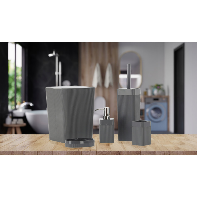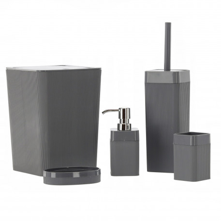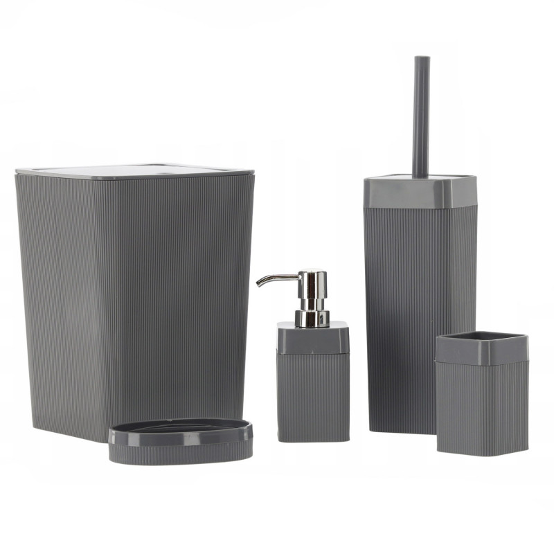 SET DE BAIE PATRAT 5 ELEMENTE Setul de baie este o combinatie moderna si foarte convenabila. Este cu siguranta un set ce nu poate lipsi din baia ta. In acest set de 5 piese exista literalmente tot ce aveti nevoie pentru baie. Setul a fost creat pentru toti cei care apreciaza eleganta combinata cu simplitatea si confortul. Robust, stabil, usor de utilizat si care economiseste spatiu, setul este fabricat din plastic de inalta calitate. SETUL CUPRINDE: Cos de gunoi Perie de toaleta Dozator de sapun Cupa pentru peria de toaleta Suport pentru sapun