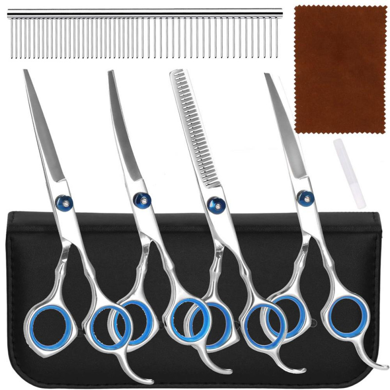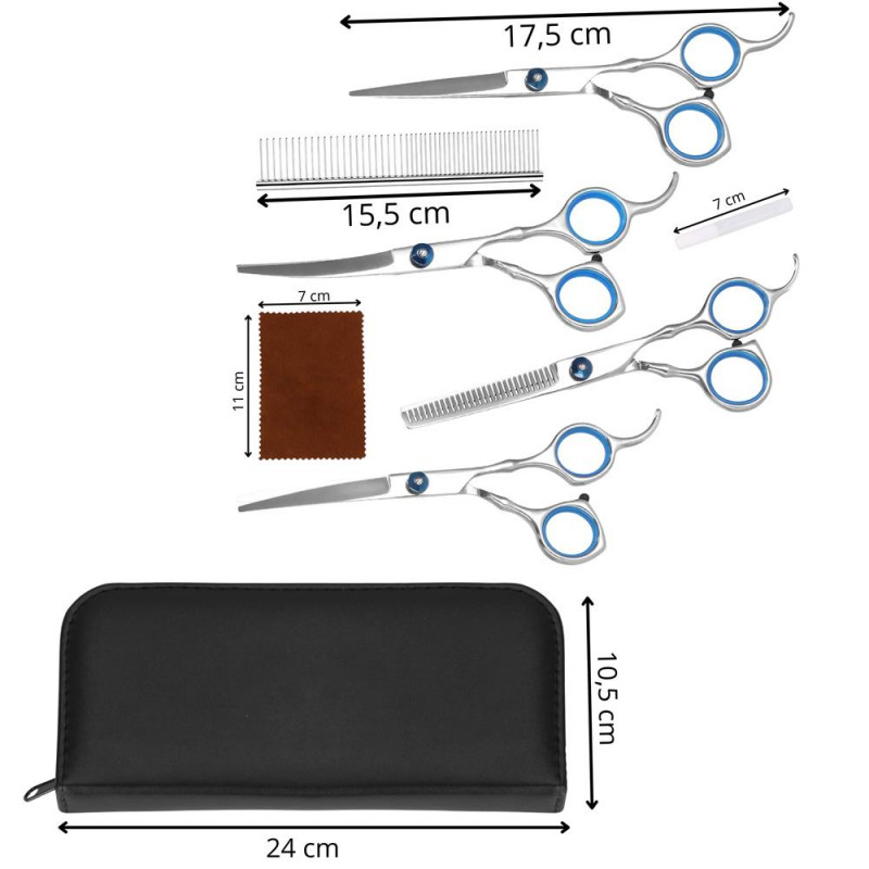 Setul include: 4 tipuri de foarfece, pieptene, carpa moale, ulei de intretinere a lamei, carcasa Daca cainele dvs. are o blana lunga, in continua crestere, care trebuie tunsa, cu siguranta merita sa folositi cele mai bune, mai sigure si mai profesionale accesorii de tuns. Cu ajutorul kitului nostru, puteti sa ii tundeti singuri, cu usurinta si in siguranta, in propria casa!