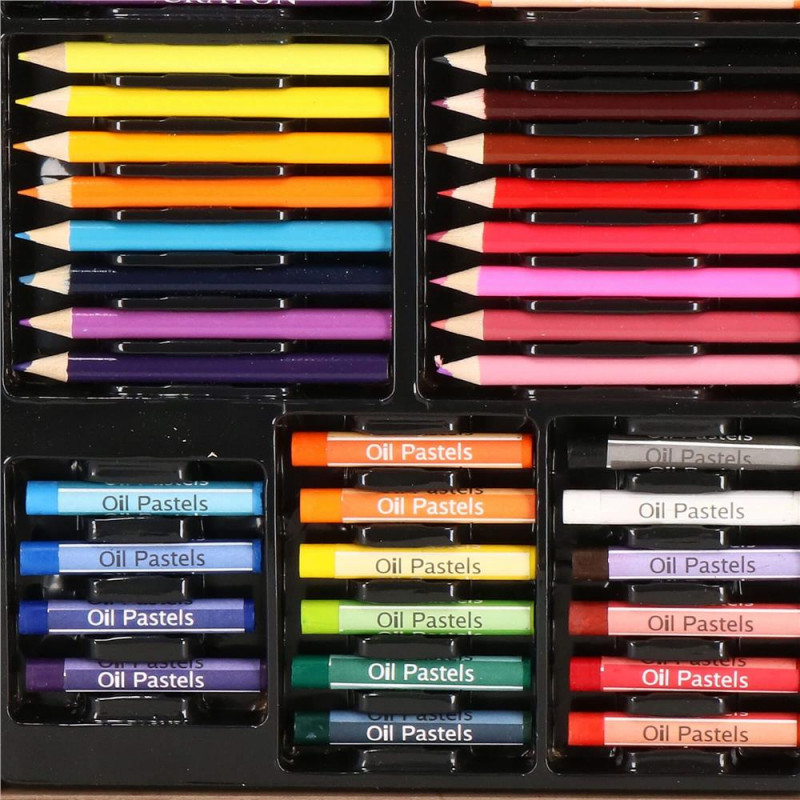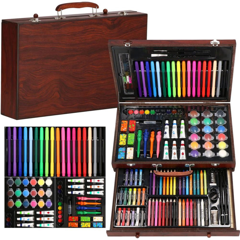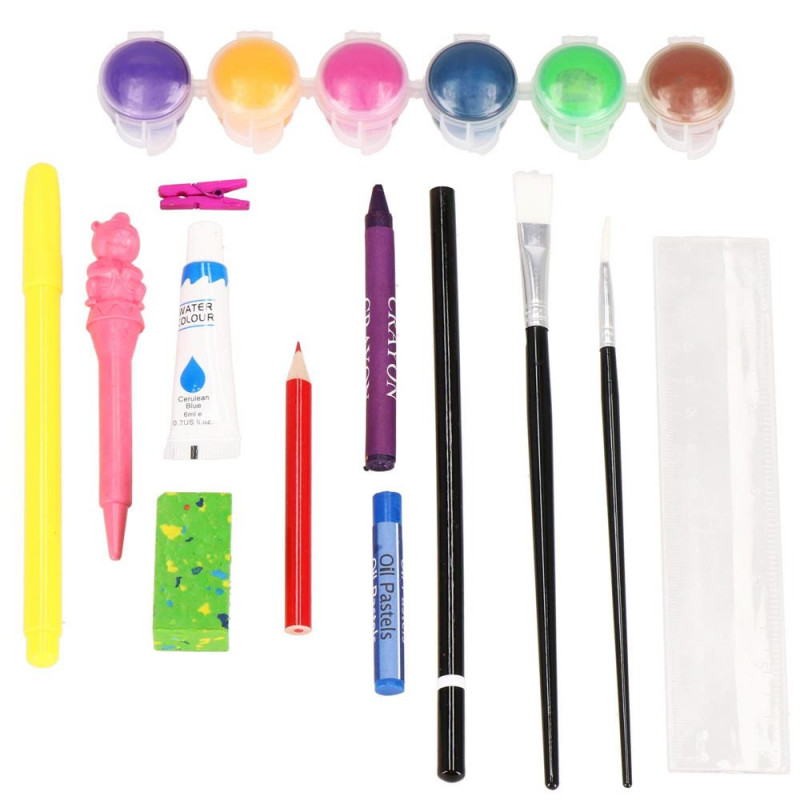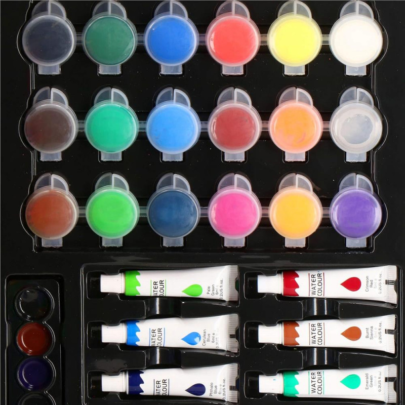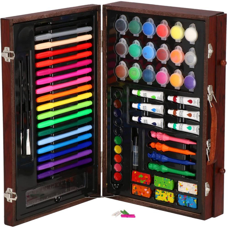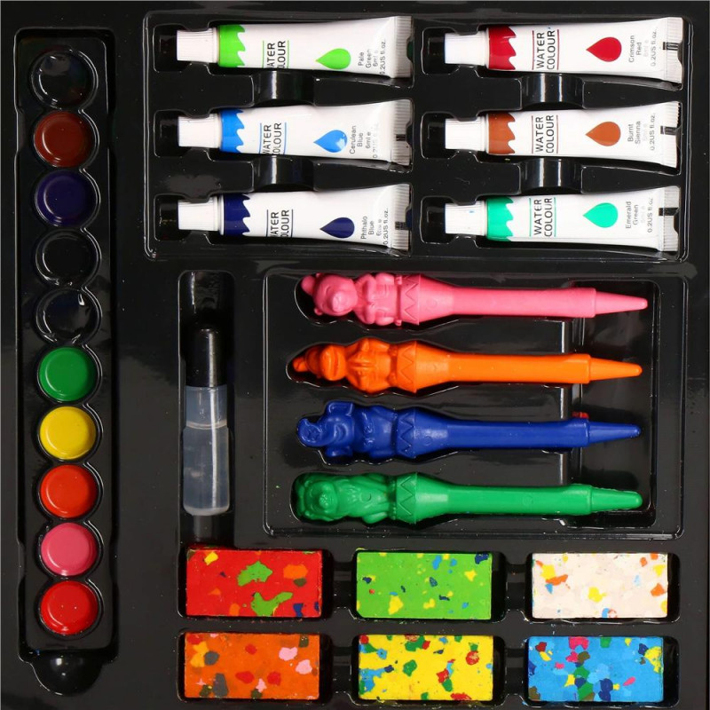 Valiza pliata: 37,5 x 23 x 8 cm Setul de arta are un total de 130 de elemente! Datorita diverselor accesorii pentru desen sau pictura, cel mai tanar membru al familiei isi va trezi creativitatea si va crea minunate opere de arta.