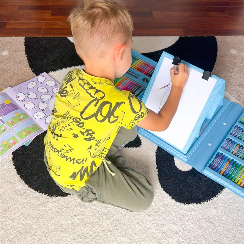 Inchidere usoara si sigura cu buton Setul de arta este ascuns in intregime in valiza, care a fost produsa in mod estetic. Cand ii deschideti interiorul, veti vedea ca are doua niveluri laterale suplimentare! Datorita acestei solutii, gazduieste si mai multe accesorii de pictura pentru tanarul artist. Copilul mic o poate lua cu incredere cu el oriunde cu ajutorul manerului de transport. La gradinita, la bunici, in vacanta sau chiar in aer liber. Fiecare parinte va observa ca, la orice varsta, un copil deseneaza diferit, are o mai buna prindere a creionului sau este mai fluent cu pensula. Cu setul de arta, puteti sustine dezvoltarea copilului dumneavoastra incepand cu varsta de 3 ani! Mai mult, crearea de desene il va ajuta, de asemenea, pe micutul dvs. sa isi gestioneze mai bine emotiile, transferandu-le pe o bucata de hartie.