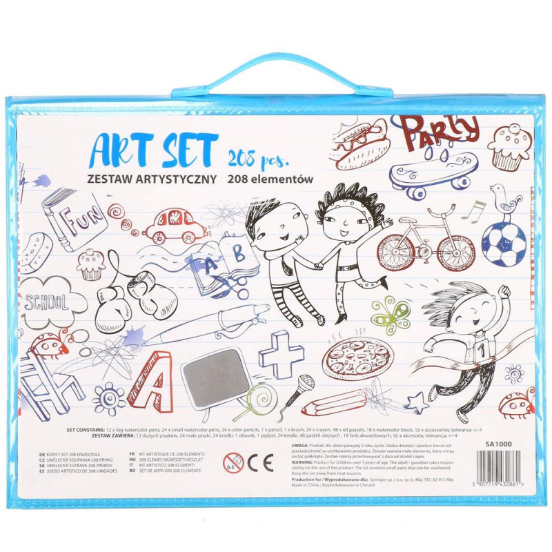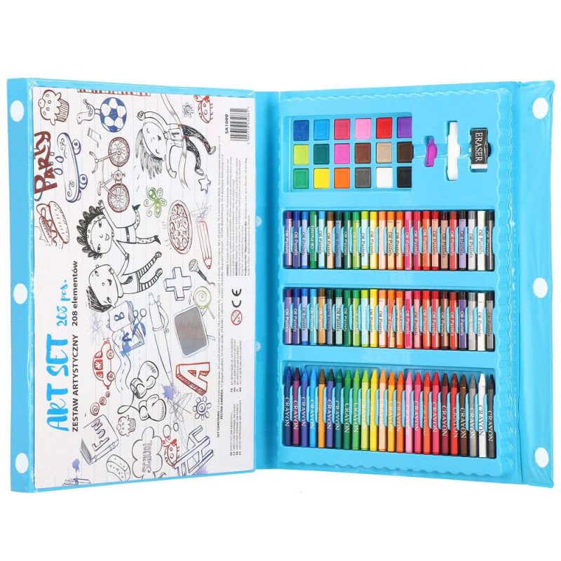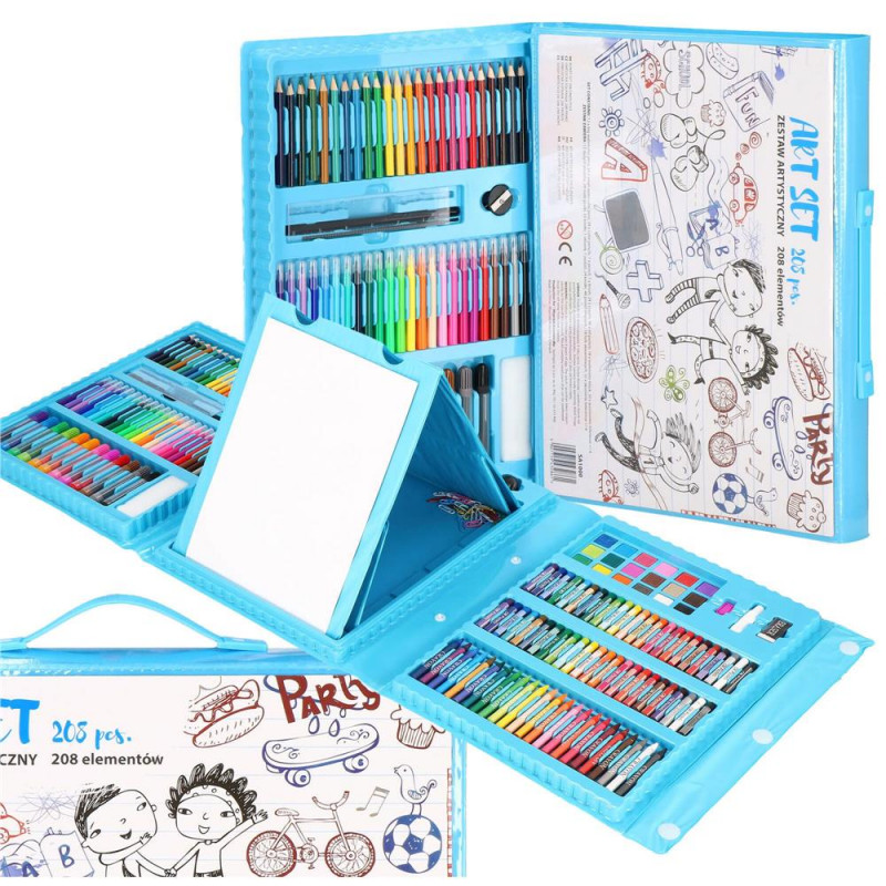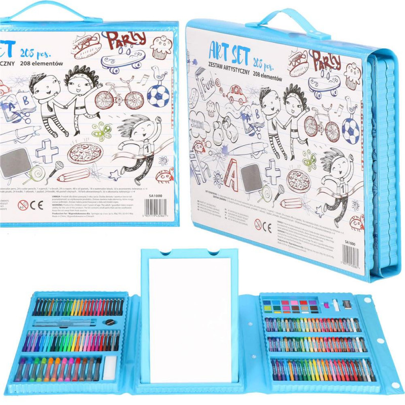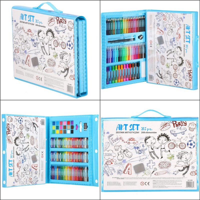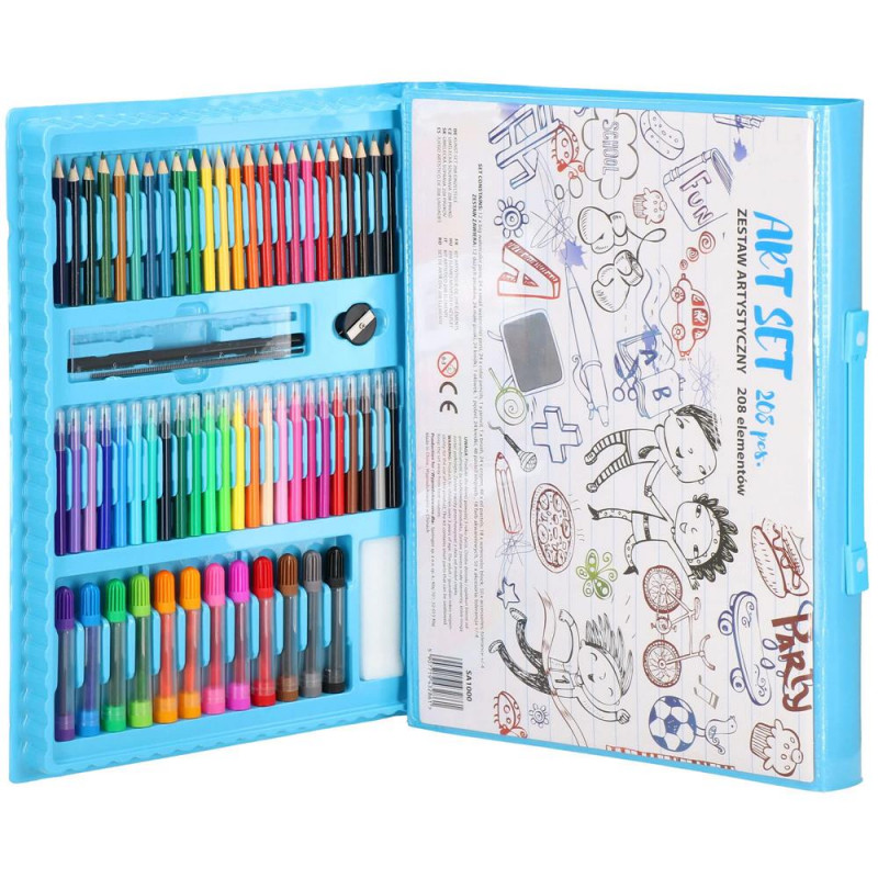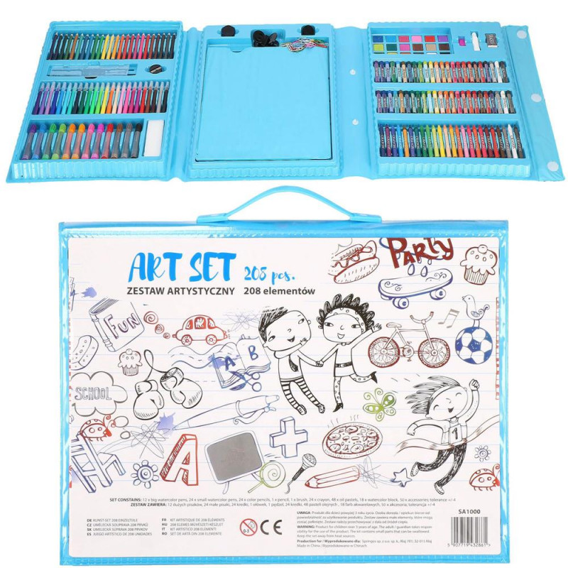 Pliere: intr-o valiza cu maner de transport Setul de arta are un total de 208 de elemente! Datorita diverselor accesorii pentru desen sau pictura, cel mai tanar membru al familiei isi va trezi creativitatea si va crea minunate opere de arta.