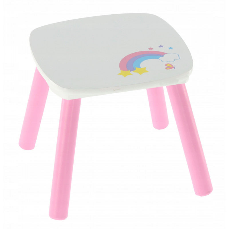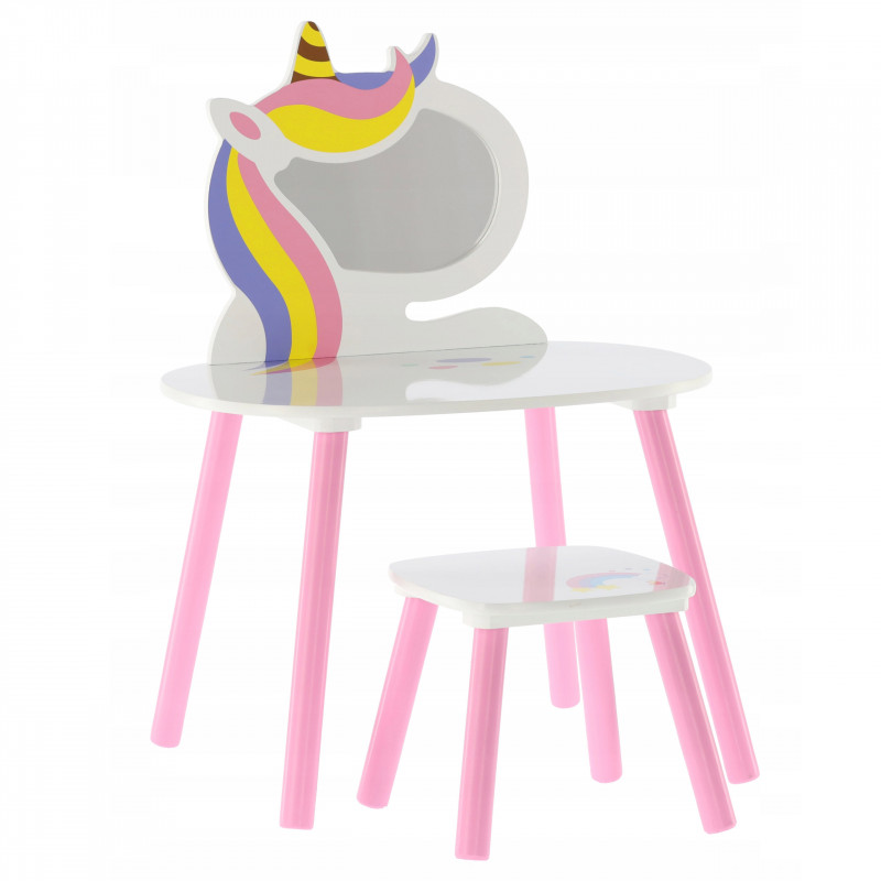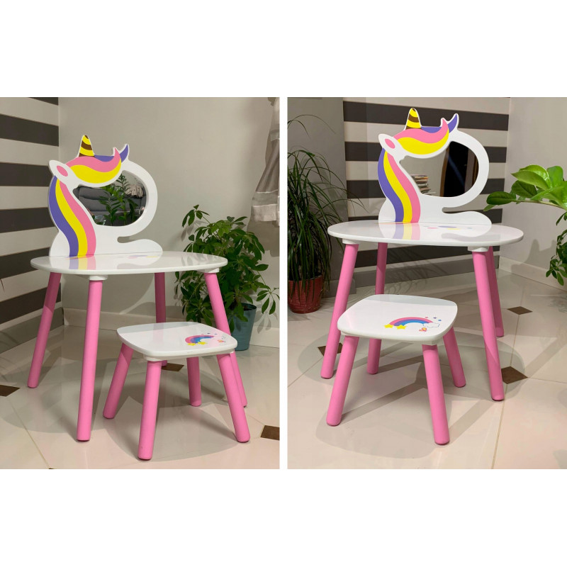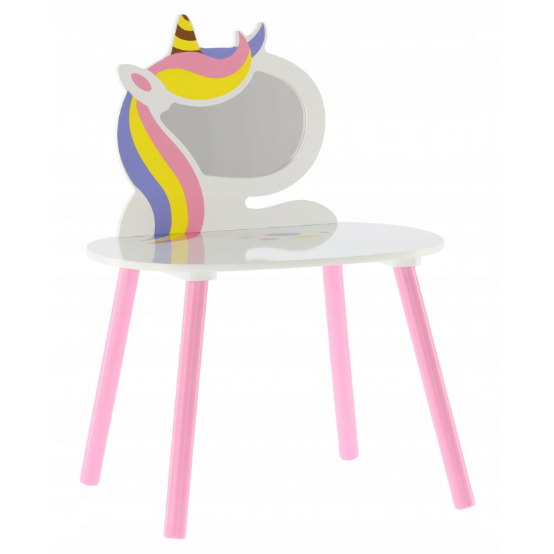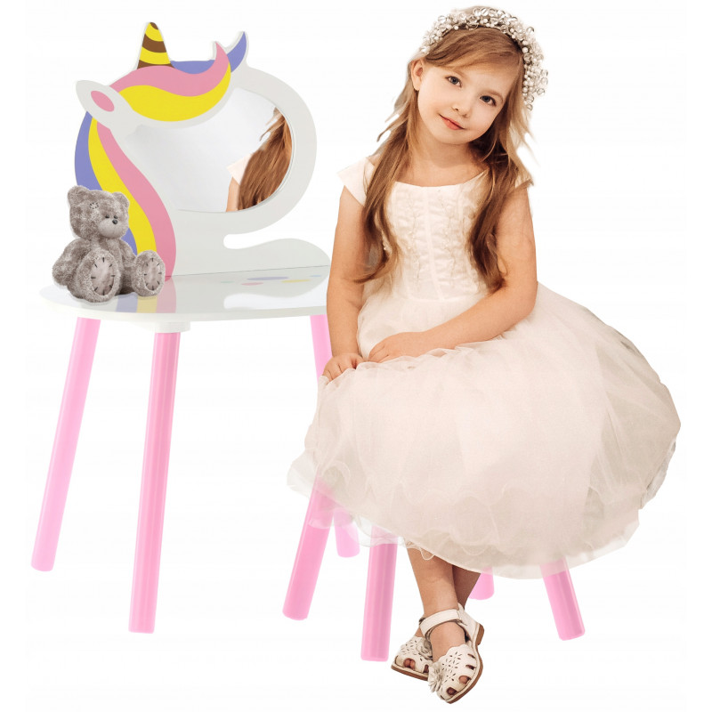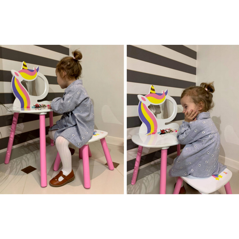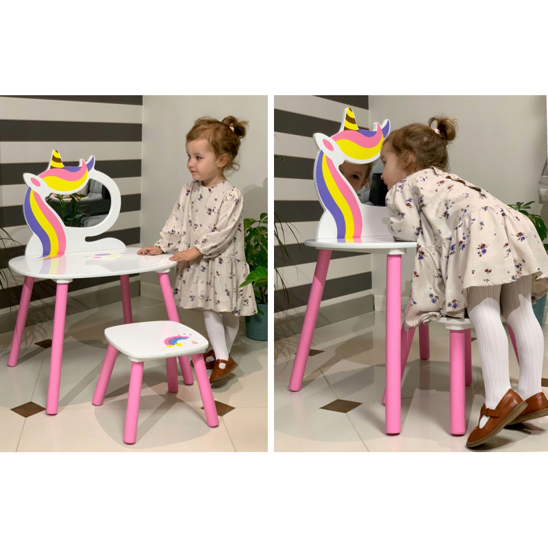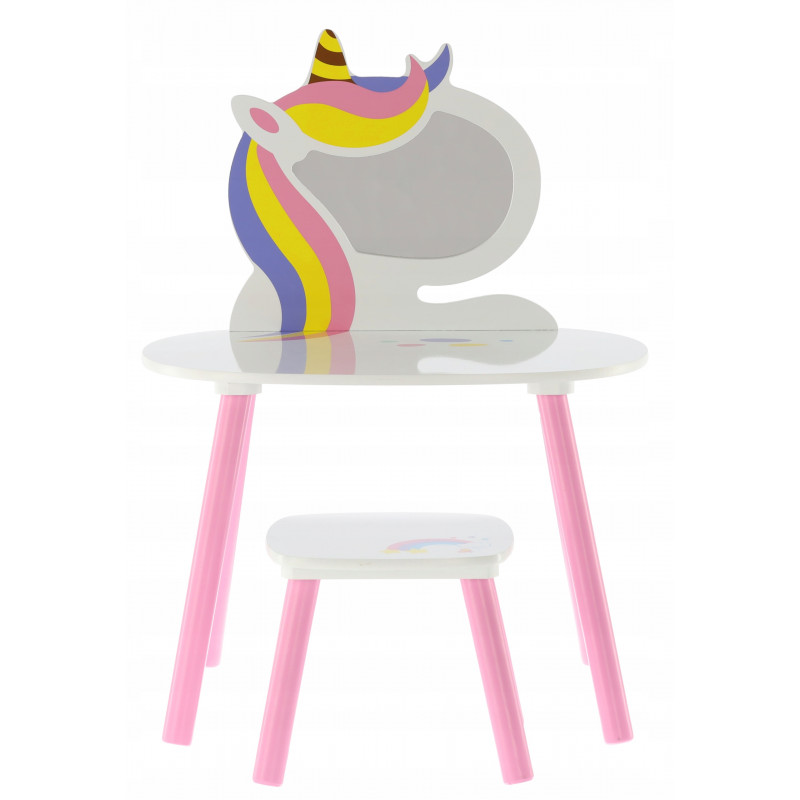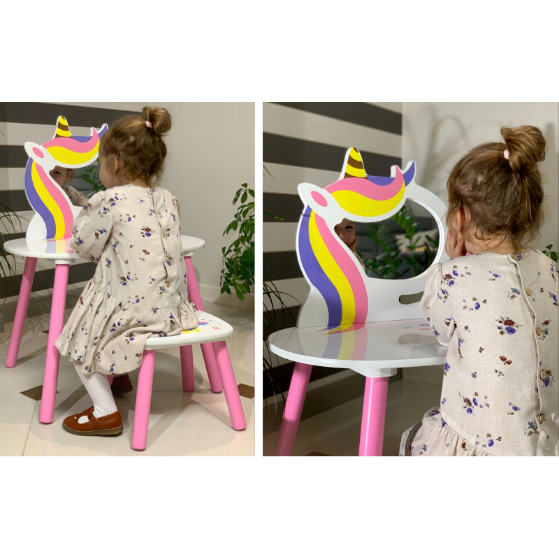 O masuta de toaleta alba cu model curcubeu din lemn masiv este piesa de mobilier perfecta pentru fiecare fata. Masa de toaleta va functiona ca un loc in care vor fi create lucrari uimitoare ale copilului dumneavoastra. Cu ea, fiica ta va incepe sa-si dezvolte creativitatea. Setul include un scaun cu model curcubeu. Picioarele sunt din lemn de pin iar sezutul este din MDF.