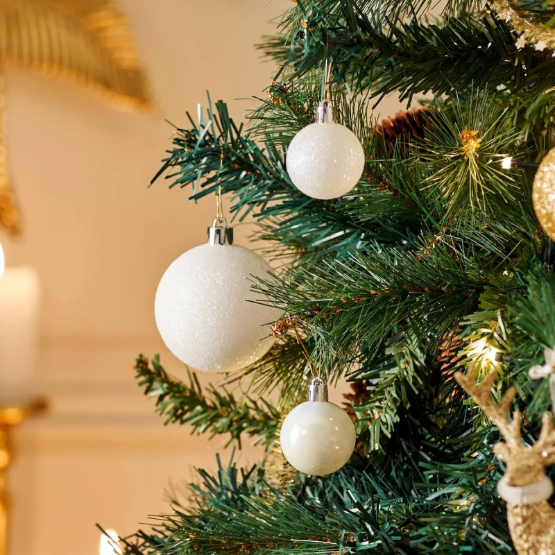 Continut set: 1 varf de brad 20 cm, 1 ghirlanda 7 cm, 24 globuri 30 mm, 16 globuri 60 mm, 2 mini brazi