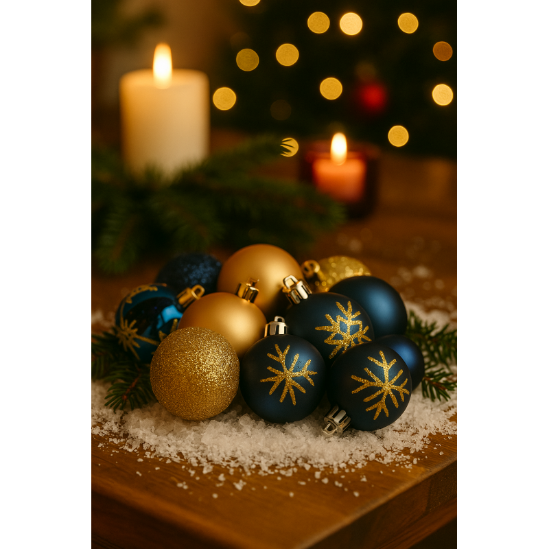Scurta descriere Set complet de decoratiuni pentru bradul de Craciun, in nuante elegante de auriu si albastru, ideal pentru un decor festiv rafinat. Include globuri de diverse marimi, o ghirlanda stralucitoare si un varf clasic pentru brad.