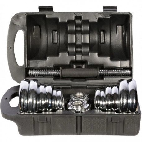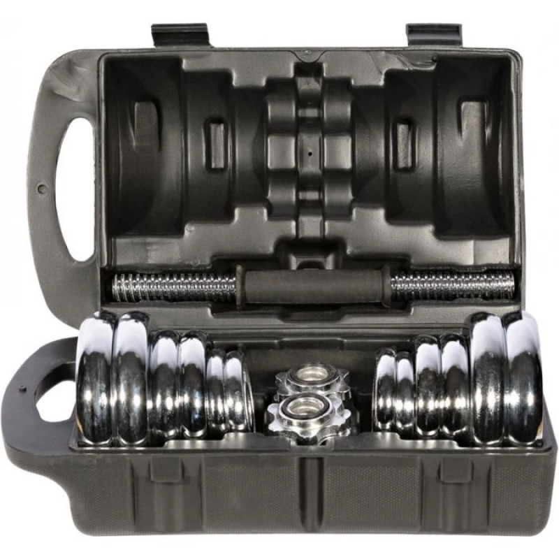 Setul de gantere cu geanta de transport tip servieta este ideal pentru antrenament acasa sau in aer liber. Le puteti transporta oriunde si le puteti depozita in siguranta. Puteti regla in mod liber greutatea pentru a va satisface nevoile de antrenament. Kitul de gantere de fitness este fabricat din fonta solida cu finisaj metalic cromat, care va ofera posibilitatea de a le folosi mult timp de acum inainte.Caracteristici:Materiale de inalta calitateDestinat uzului casnicFinisaj metalic cromatManere cu contur ergonomic, antiderapantSetul contine: discuri (8*2,5 kg, 4*1,25 kg, 4*0,5 kg), 4 coliere, 2 bare scurteGreutate: 30 kg (2 gantere a cate 15kg fiecare)Producator: Hiperlion