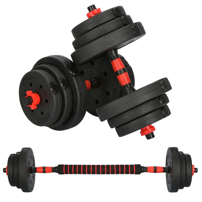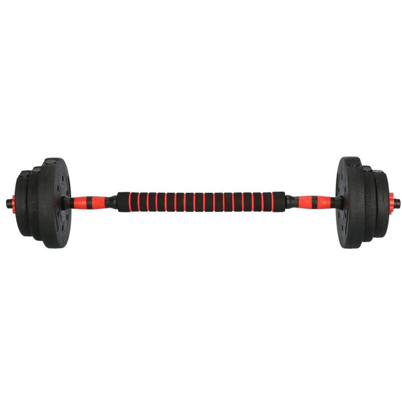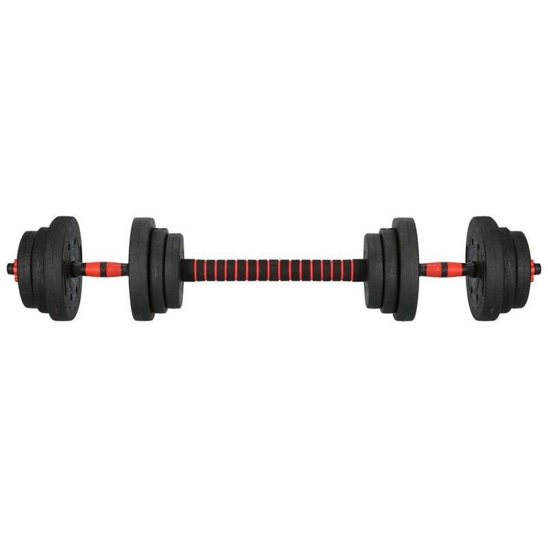 Setul gantere de 2 x 10 kg Antrenamentul cu greutati, cu discuri interschimbabile este esential pentru orice sala de fitness sau acasa. Setul de gantere de 2 x 10 kg este accesoriul perfect pentru antrenament acasa, datorita discurilor cu invelis din polipropilena care va protejeaza parchetul de lovituri si zgarieturi.Acest set este compus din 2 gantere, care se pot uni astfel incat sa formeze o haltera. Barile pentru gantere au o lungime de 40 cm care se transforma usor intr-o bara de haltere de 93 cm, largind astfel gama de antrenamente ce pot fi efectuate cu acest set.Setul include doua bare gantere, patru sigurante, o bara de conectare si 12 discuri Discurile sunt realizate din polipropilena umplute cu ciment