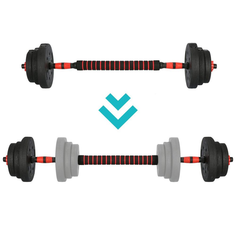 Setul gantere de 2 x 15 kg Antrenamentul cu greutati, cu discuri interschimbabile este esential pentru orice sala de fitness sau acasa. Setul de gantere de 2 x 15 kg este accesoriul perfect pentru antrenament acasa, datorita discurilor cu invelis din polipropilena care va protejeaza parchetul de lovituri si zgarieturi.Acest set este compus din 2 gantere, care se pot uni astfel incat sa formeze o haltera. Barile pentru gantere au o lungime de 40 cm care se transforma usor intr-o bara de haltere de 93 cm, largind astfel gama de antrenamente ce pot fi efectuate cu acest set.Setul include doua bare gantere, patru sigurante, o bara de conectare si 16 discuri Discurile sunt realizate din polipropilena umplute cu ciment