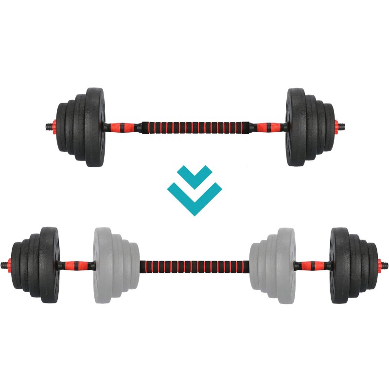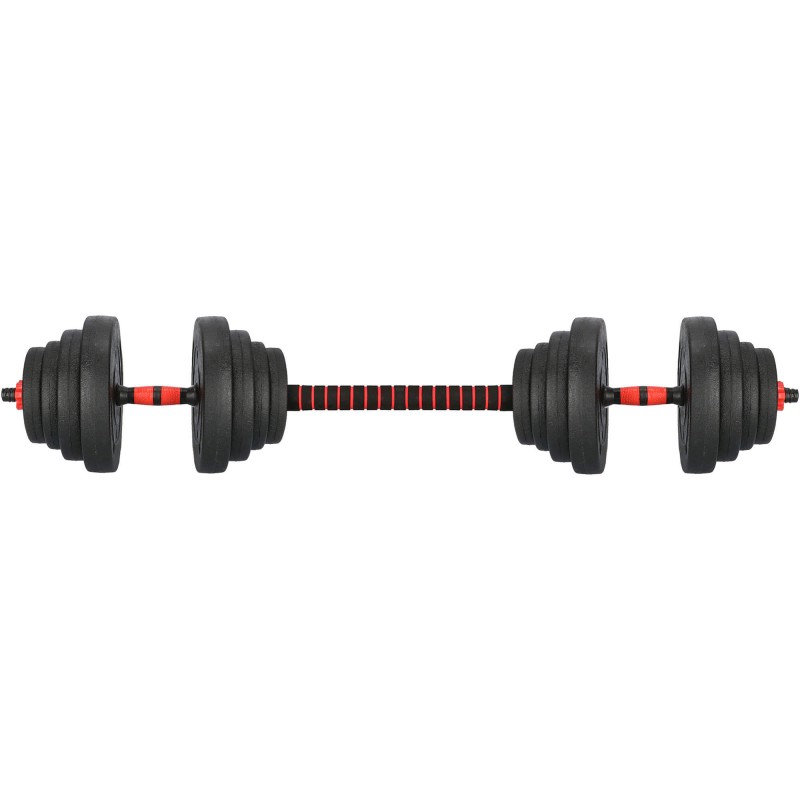 Setul gantere de 2 x 20 kg Antrenamentul cu greutati, cu discuri interschimbabile este esential pentru orice sala de fitness sau acasa. Setul de gantere de 2 x 20 kg este accesoriul perfect pentru antrenament acasa, datorita discurilor cu invelis din polipropilena care va protejeaza parchetul de lovituri si zgarieturi.Acest set este compus din 2 gantere, care se pot uni astfel incat sa formeze o haltera. Barile pentru gantere au o lungime de 40 cm care se transforma usor intr-o bara de haltere de 93 cm, largind astfel gama de antrenamente ce pot fi efectuate cu acest set.Setul include doua bare gantere, patru sigurante, o bara de conectare si 12 discuri Discurile sunt realizate din polipropilena umplute cu ciment
