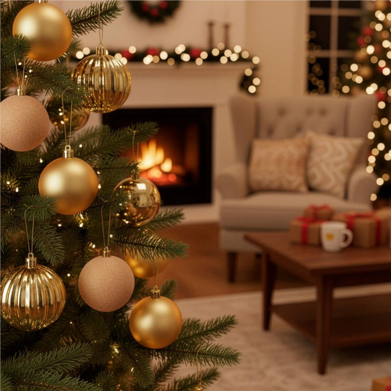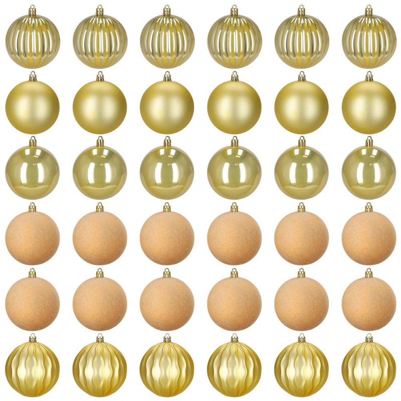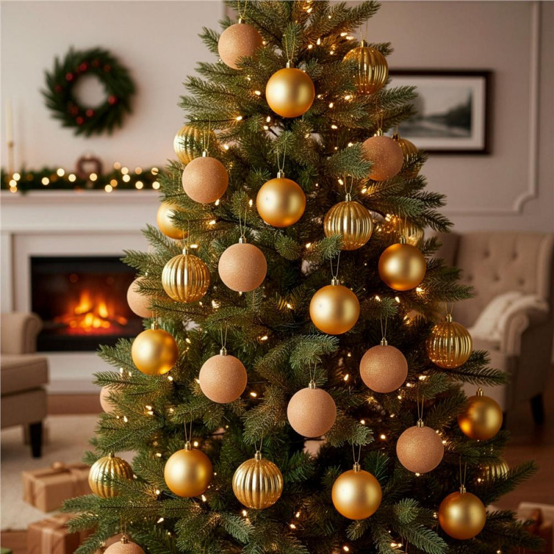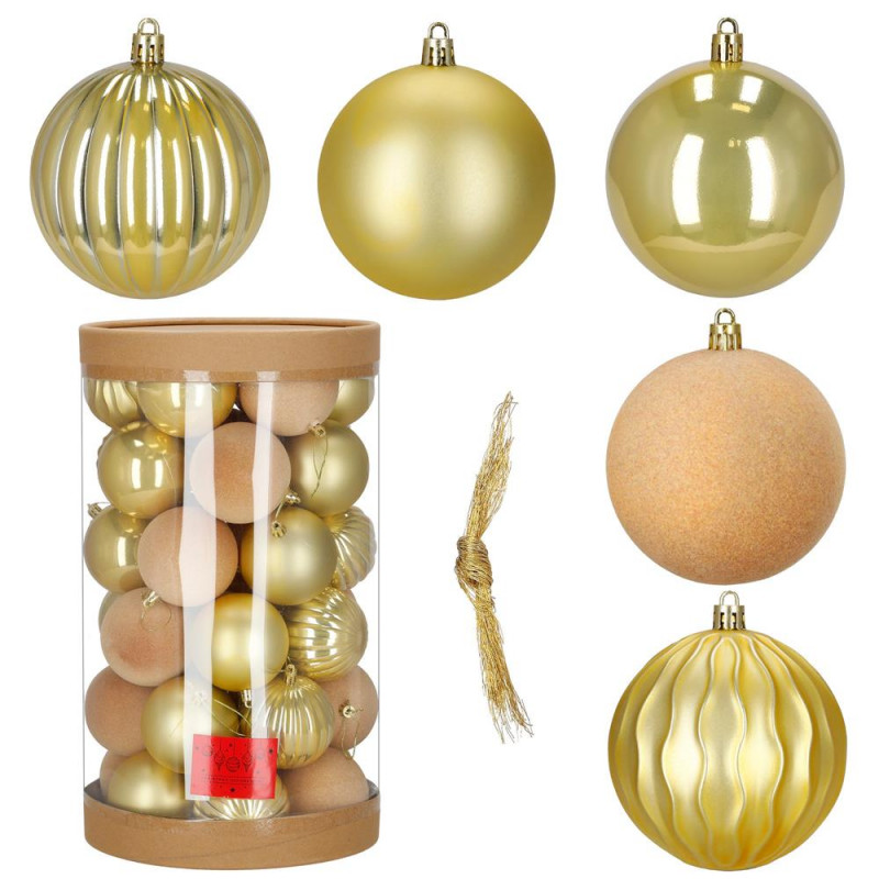 Scurta descriere Set format din 36 globuri decorative din plastic rezistent, in nuante elegante de auriu si ecru. Globurile includ finisaje variate – lucios, semimat, catifelat si spiralat – oferind un aspect bogat si armonios pentru decorul de sarbatori. Sunt durabile si sigure, ideale pentru brad, coronite sau aranjamente festive.