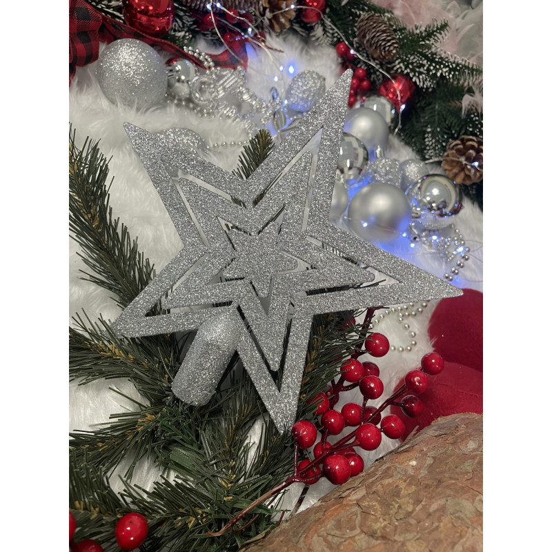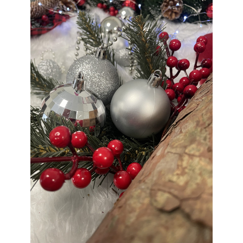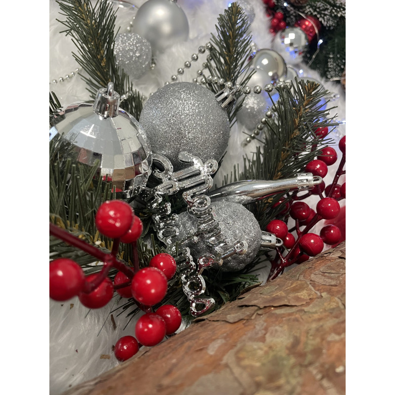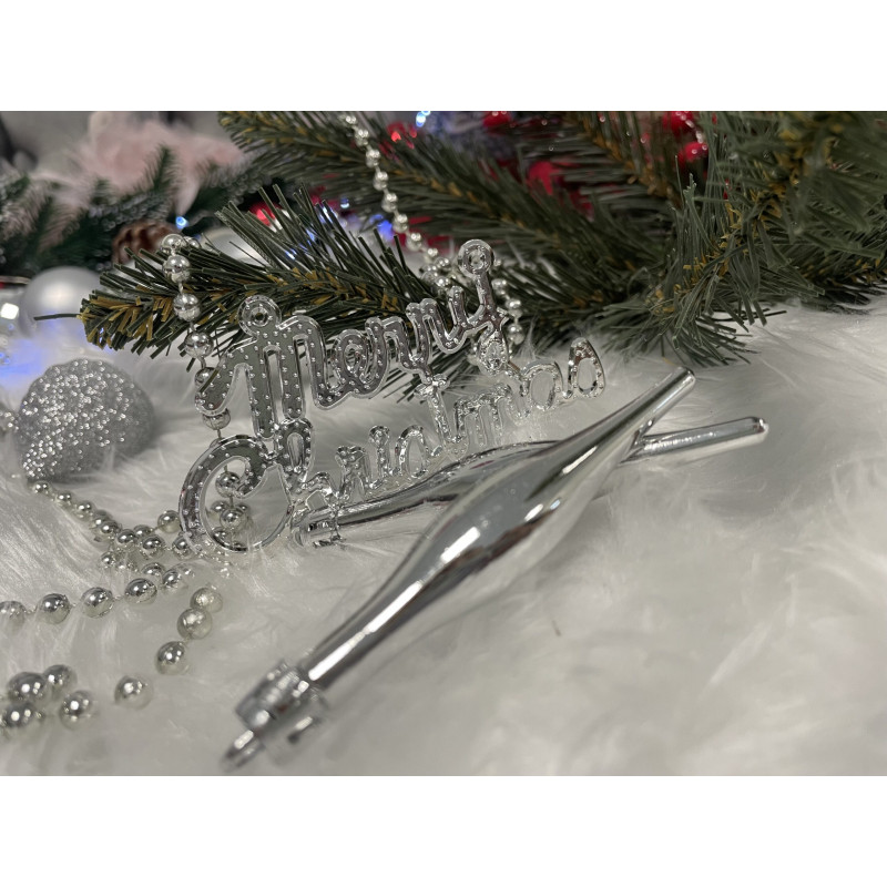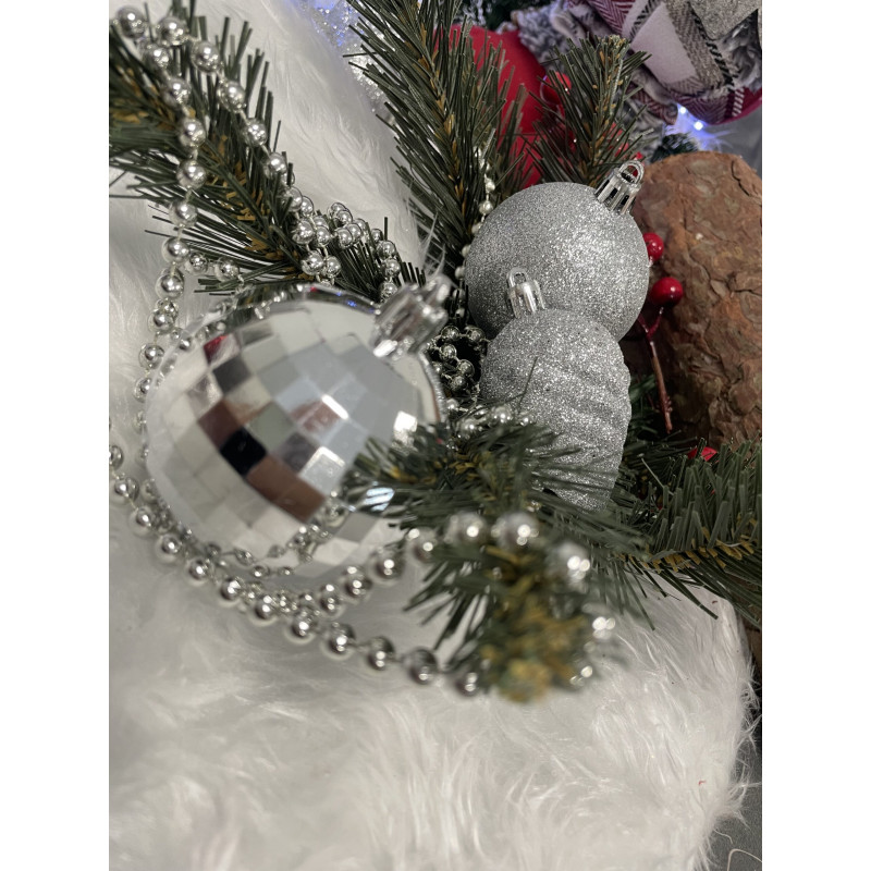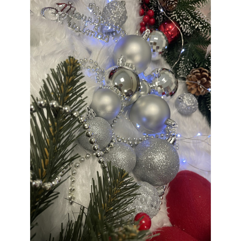 Cantitate: 51 bucati globuri (+/- 1 bucata), 1 stea, 1 lant de margele, 3 decoratiuni Craciun fericit