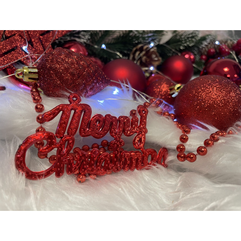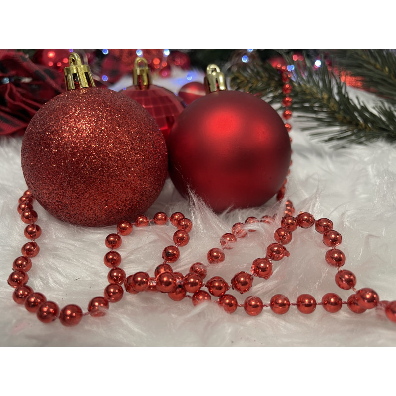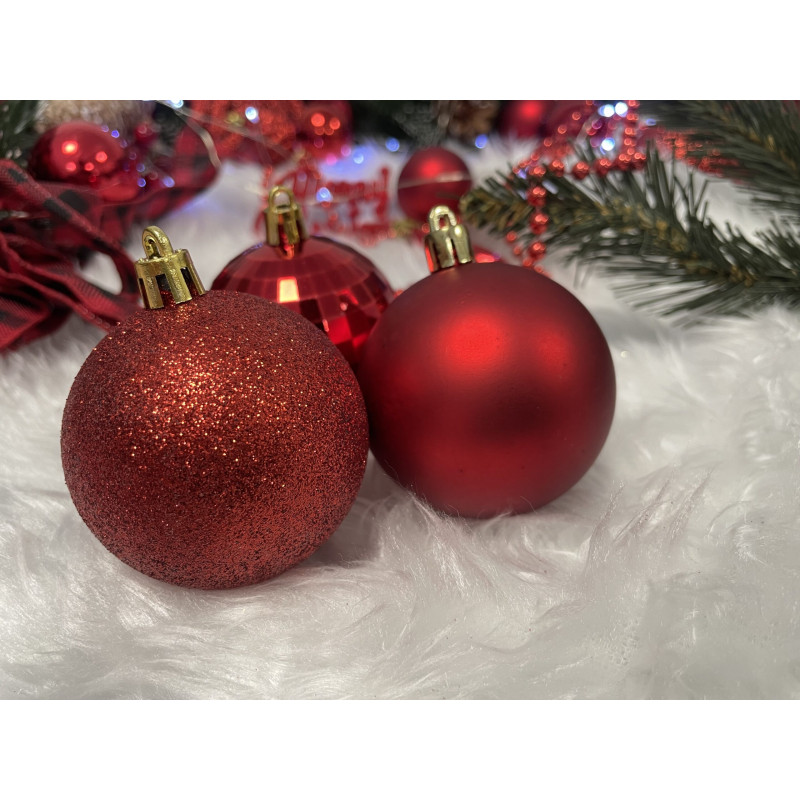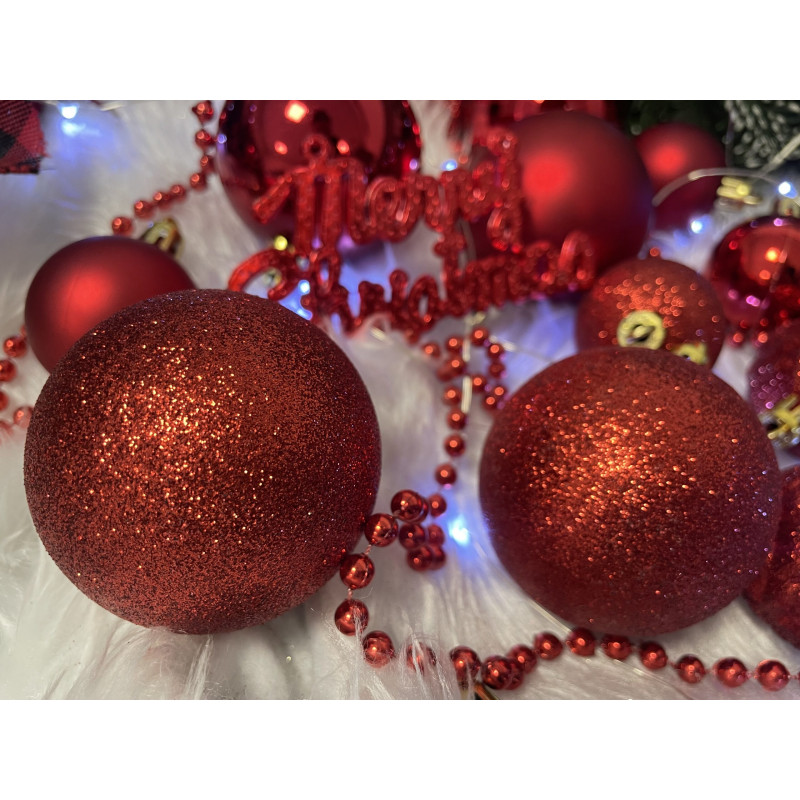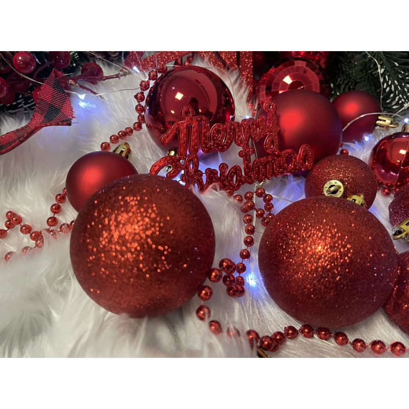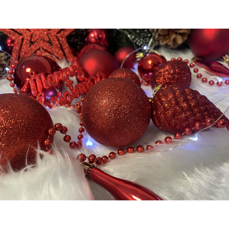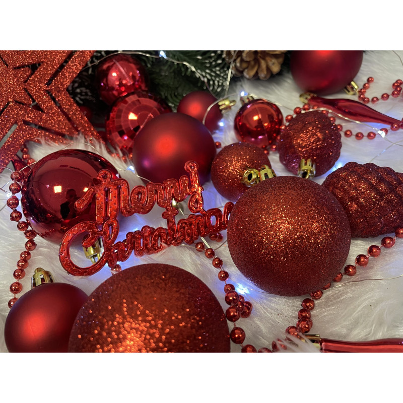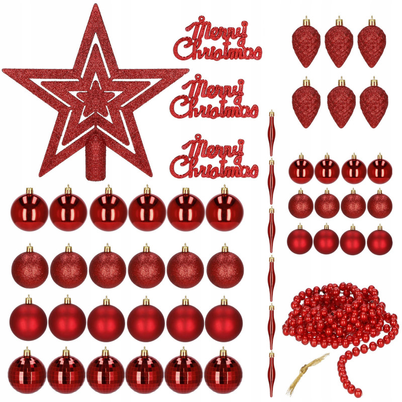 Cantitate: 51 bucati globuri (+/- 1 bucata), 1 stea, 1 lant de margele, 3 decoratiuni Craciun fericit