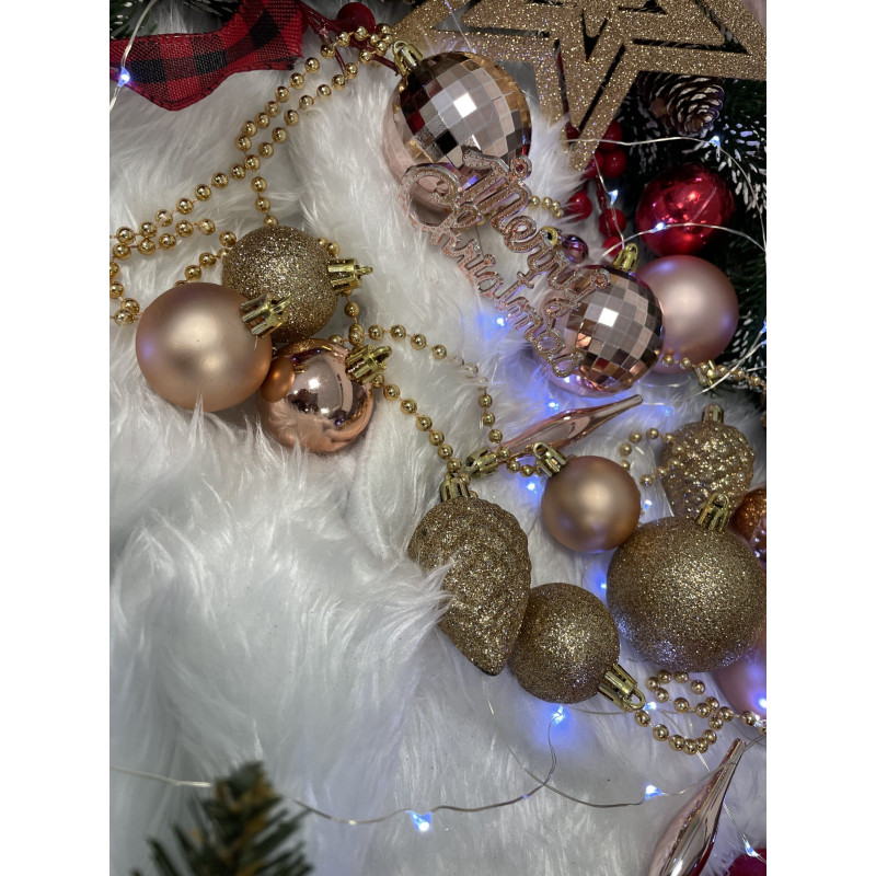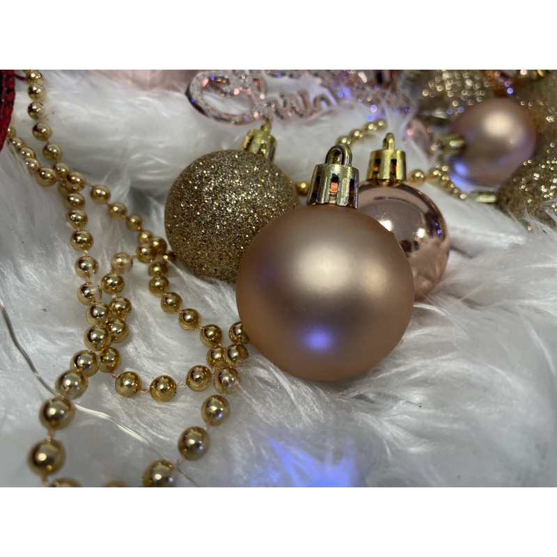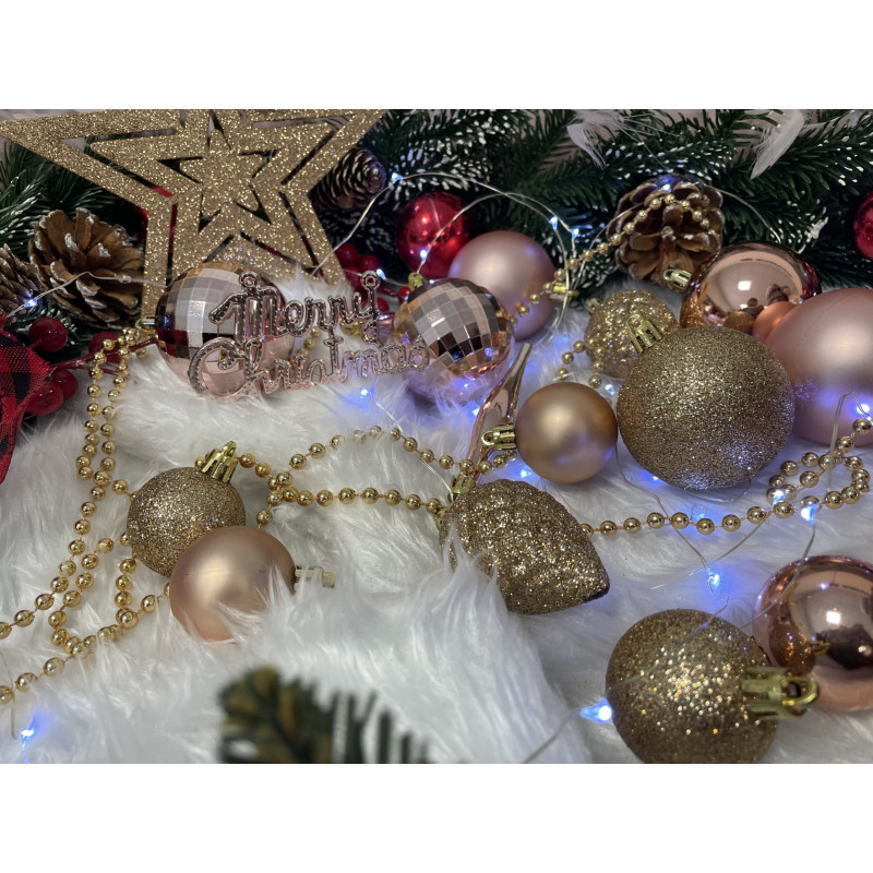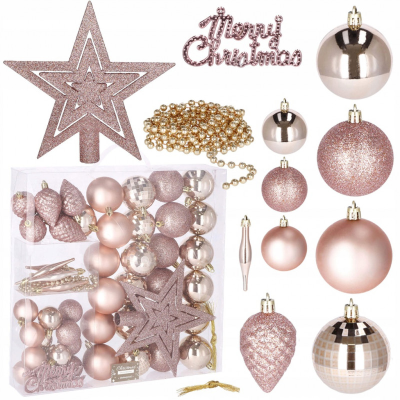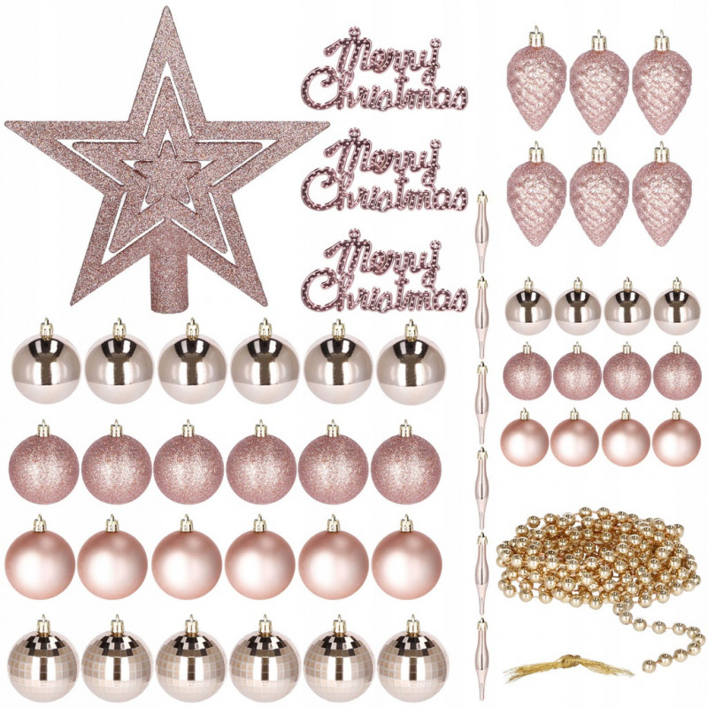 Cantitate: 51 bucati globuri (+/- 1 bucata), 1 stea, 1 lant de margele, 3 decoratiuni Craciun fericit