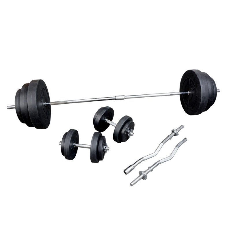 Setul reglabil gantere si haltera de 91 kg ofera un mod simplu si foarte eficient de a va consolida si tonifia intregul corp. Poate fi utilizat ca un accesoriu independent sau folosit impreuna cu o banca de antrenament. Greutatea barei poate fi ajustata dupa bunul dumneavoastra plac, prin adaugarea sau indepartarea discurilor.Pozitia mainilor pe bara este una cat se poate de naturala, unghiul oferind mai mult confort pentru coate si incheieturi. Este ideal pentru zona superioara a corpului.Este destinat antrenamentului de acasa, datorita barei compusa din 2 parti, pentru economie de spatiu si a discurilor acoperite cu vinil.Discurile sunt din ciment acoperite cu vinile, iar bara este metalica.Setul include: discuri 2*15 kg, 2*10 kg, 2*5 kg, 4*2.5 kg, 4*1.25 kg; bara dreapta 1,8 m (7,2 kg), bara curbata 1,2 m (5,17 kg), 2 bare de 45 cm (4,1 kg).Diametru bara: 25 mmGreutate maxima incarcare: 90 kg (se livreaza in 2 colete).Producator: TheWay Fitness.