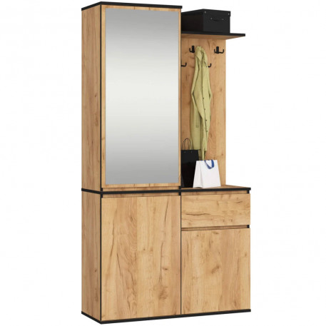 Scurta descriere Set complet pentru amenajarea holului, potrivit pentru spatii inguste. Include dulap cu oglinda si bara pentru haine, sertar pentru accesorii, rafturi pentru pantofi si cuier cu carlige. Compartimentarea inteligenta permite organizarea eficienta a hainelor si incaltamintei fara a ocupa mult spatiu. Realizat din pal laminat de 16 mm, cu margini protejate prin cant ABS pentru rezistenta sporita.
