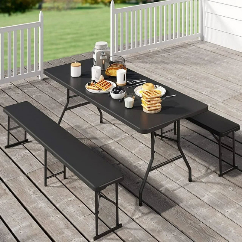 Set de mobilier pentru curte, terase sau gradina format dintr-o masa si 2 banci pliabile complet tip valiza cu picioare si cadru metalice si blat din plastic ABS, perfect pentru evenimente in aer liber, camping, in curte sau gradina de acasa. Atat designul mesei cat si bancile au fost concepute astfel incat sa poata fi pliate si depozitate cu usurinta. Aceasta caracteristica este extrem de utila atunci cand organizati evenimente mari, mese festive, festivaluri, zilele orasului sau terase temporare. Bancile au 3 picioare metalice de sprijin, ceea ce le face foarte stabile si rezistente la greutate mare, nu se curbeaza la mijloc. Atat masa cat si bancile sunt prevazute cu cleme metalice pentru a plia si fixa picioarele de sustinere.Atat blatul mesei cat si sezutul bancilor sunt fabricate dintr-un material plastic ABS foarte rezistent, atat la socuri cat si la conditiile meteorologice, ploaie sau zapada. Setul este potrivit atat pentru exterior cat si pentru interior. In doar cateva secunde puteti asambla acest set de mese cu scaune pentru a crea un colt gastronomic perfect in gradina dvs., ideal pentru festivaluri, petreceri mari si gratare cu prietenii. Setul este suficient pentru 6 persoane, iar plierea completa tip valiza cu manere si cleme de siguranta pentru a evita deschiderea accidentala faciliteaza transportul si depozitarea acestuia, intrand fara probleme si in portbagajul unei masini de mici dimensiuni.