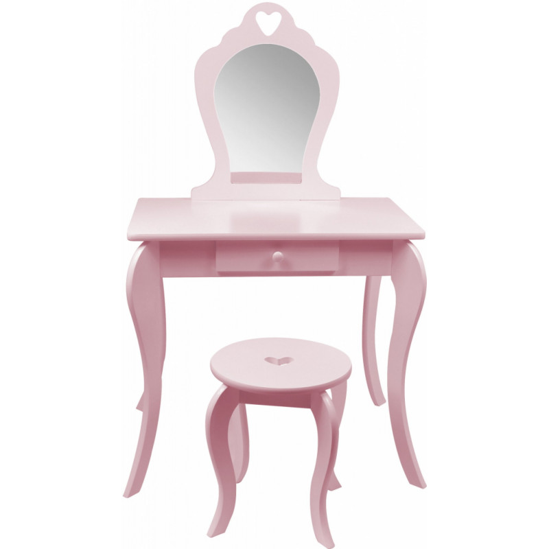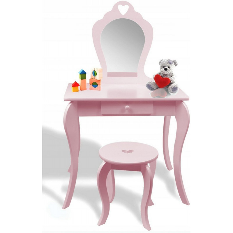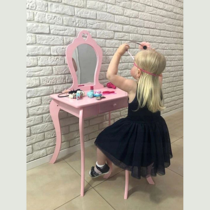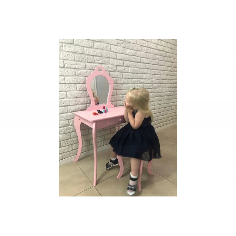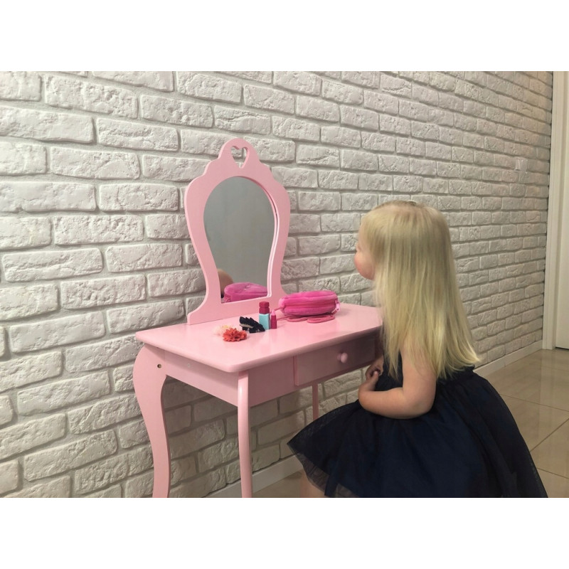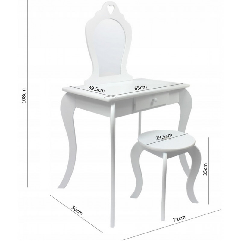 Viseaza si micuta ta la propria masuta de toaleta? Masuta noastra de toaleta pentru fete este solutia perfecta pentru micile printese. Cu siguranta va satisface cerintele celor mai exigente domnisoare. Ideal pentru camera unui copil. De asemenea, ca un decor interesant. Masuta de toaleta va fi cu siguranta pe placul oricarei fetite care adora sa se imbrace si sa-si imite mama atunci cand se machiaza. SPECIFICATII: Oglinda de siguranta (care nu este din sticla)Stil de epoca Fabricat din placi de mobilier MDFSertar spatios Decor delicat Scaun inclus Poate fi montat pe perete Dimensiunile indicate in imaginea de mai jos