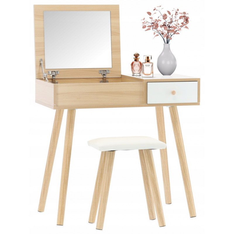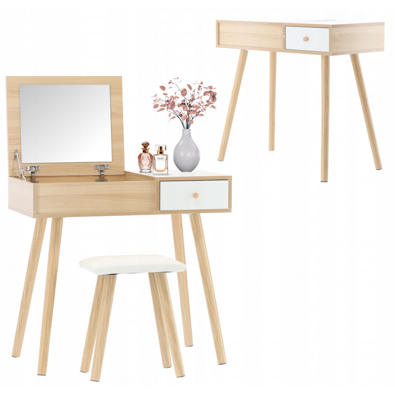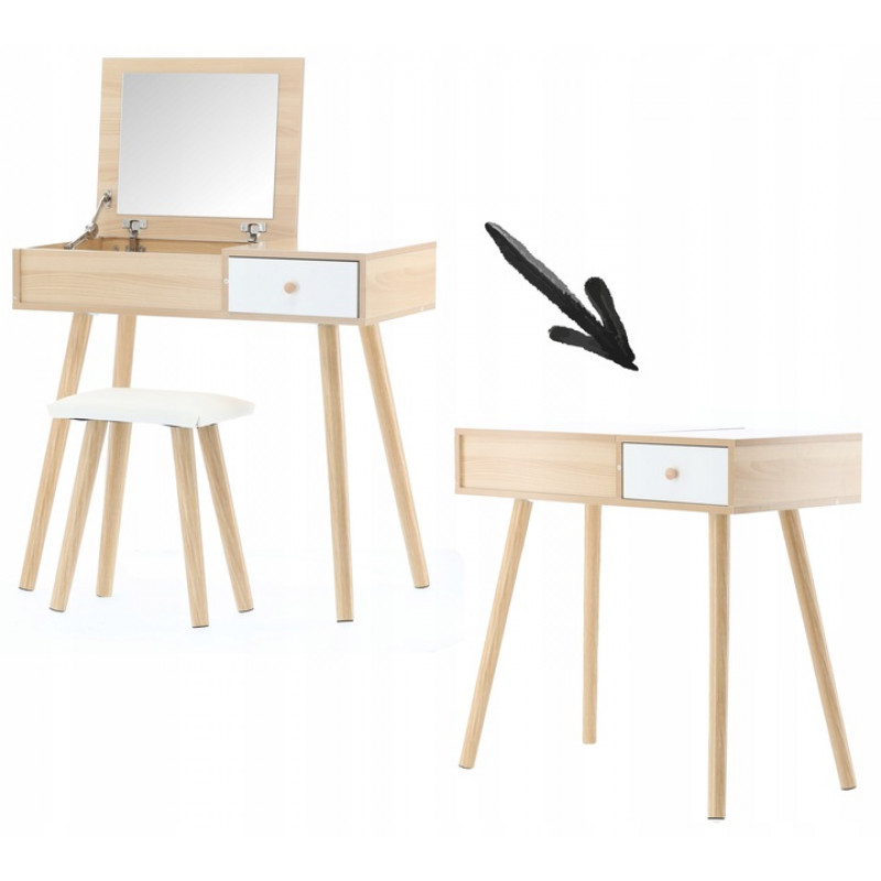 Inaltime: 114 cm Visezi la propriul tau loc de ingrijire zilnica, care in acelasi timp adauga farmec spatiului tau? Aceasta masuta de toaleta eleganta in stil retro este solutia perfecta pentru tine! Realizata din lemn de inalta calitate, aceasta masa de toaleta compacta va va oferi nu numai functionalitate, ci si un aspect unic. Masuta de toaleta a fost conceputa in asa fel incat sa indeplineasca doua functii, atat ca masa de toaleta dar si birou dupa plierea oglinzii, ceea ce o face o piesa de mobilier multifunctionala.