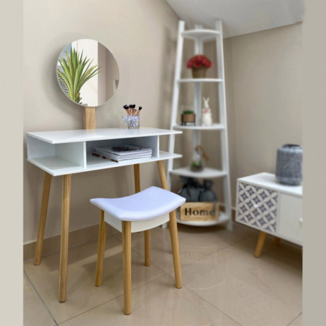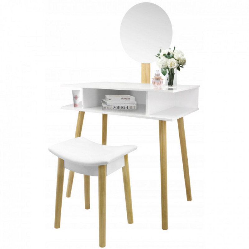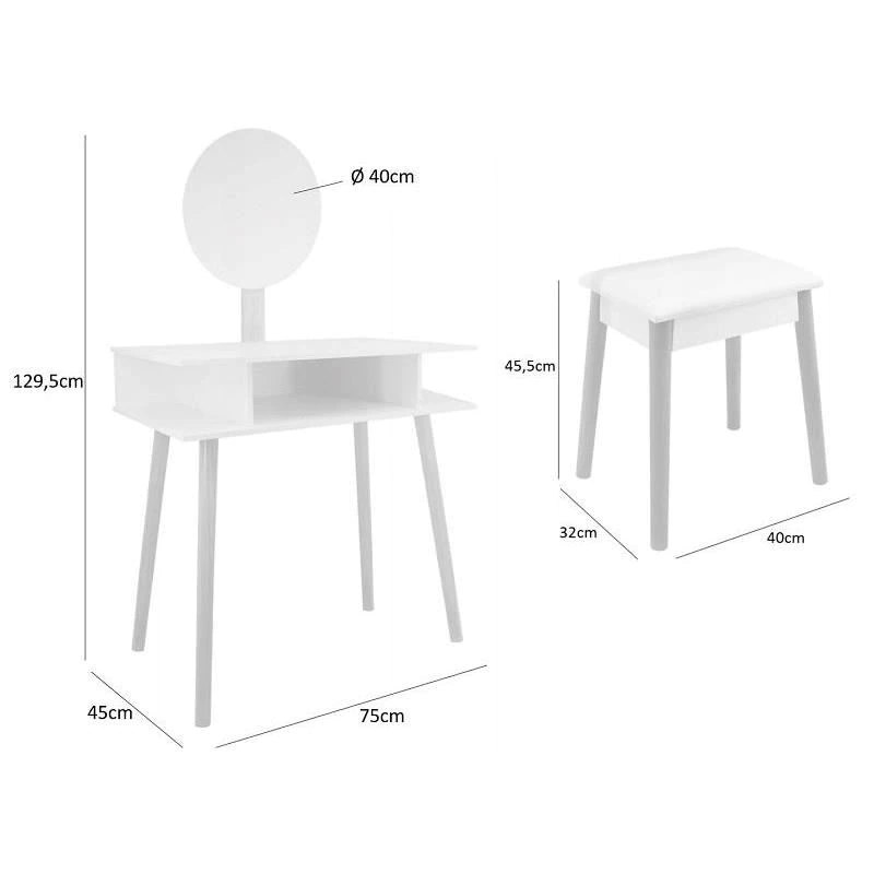 3 rafturi interioare Dimensiuni, asa cum se arata in imaginea de mai jos *Articolele prezentate in imagine (bijuterii, cosmetice) nu fac parte din masa de toaleta. Masuta noastra de toaleta este perfecta pentru dormitorul oricarei femei. Stilul modern de epoca ii va permite sa se potriveasca cu orice tip de interior. Scaunul este finisat cu o tesatura eleganta. Taburetul va adauga farmec si eleganta dormitorului dumneavoastra. Masuta de toaleta are rafturi interioare, care pot gazdui toate cosmeticele sau accesoriile de machiaj necesare.