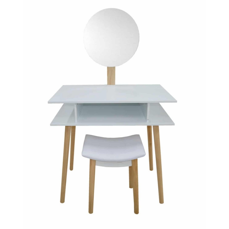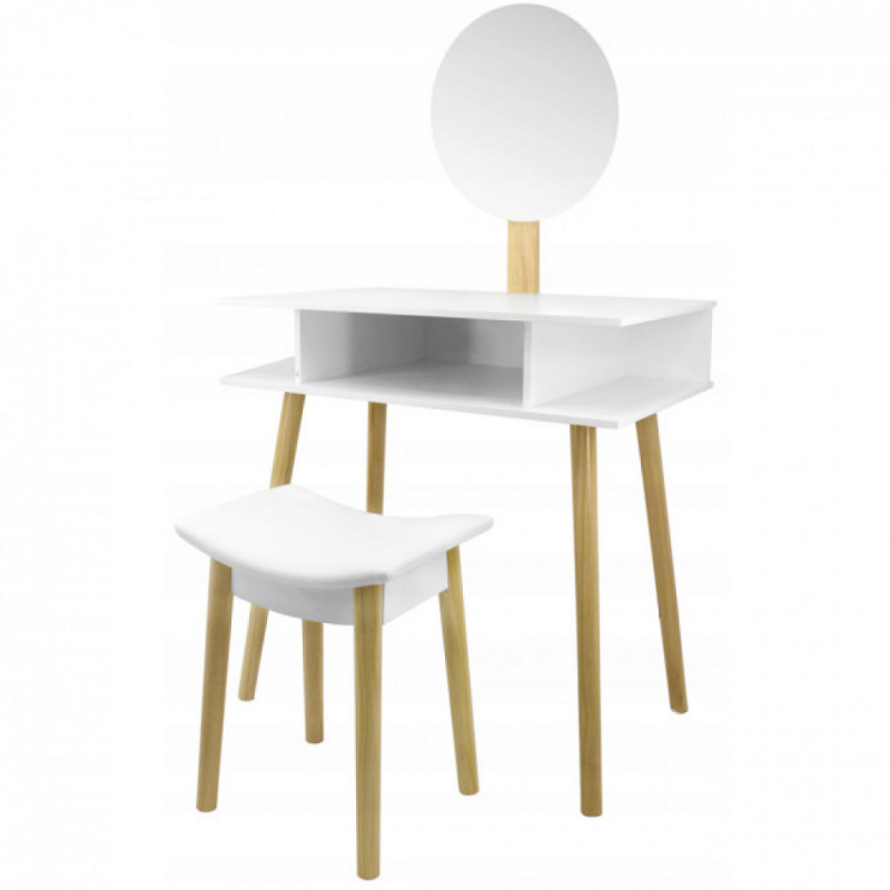 MASA DE TOALETA ALBA O masa de toaleta eleganta este visul majoritatii femeilor. Este o solutie functionala si practica. Ne permite sa ne depozitam cosmeticele sau bijuteriile preferate - o oglinda potrivita, comoditate in utilizare si confortul de a avea la indemana toate articolele necesare. Canelurile delicate il fac perfect pentru stilul scandinav. Setul include, de asemenea, un taburet confortabil, tapitat, care va adauga farmec si eleganta incaperilor dvs. PARAMETRII: