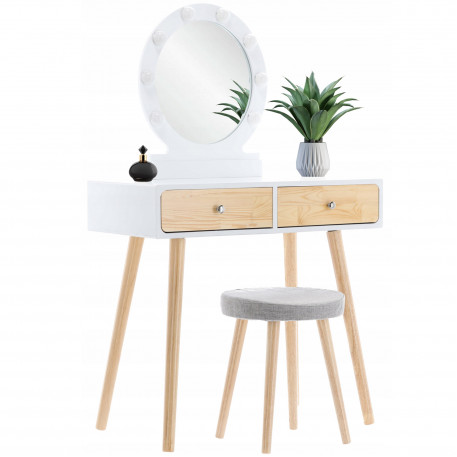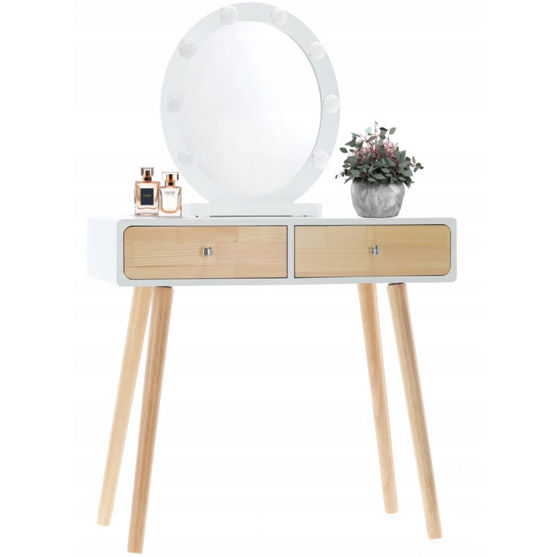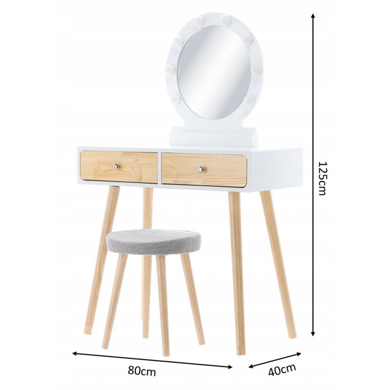 Inaltime: 125 cm Masuta de toaleta LED cu iluminare este o piesa de mobilier unica care imbina functionalitatea si designul modern. Masuta de toaleta este echipata cu iluminare LED incorporata , care ofera o lumina stralucitoare si uniforma, perfecta pentru a machia sau pentru a te pregati de iesire. Datorita luminii LED, utilizatorul poate evalua cu exactitate aspectul acestora si poate efectua cu precizie diverse tratamente cosmetice. Eleganta si functionalitate Designul simplu, scandinav, al mesei de toaleta se distinge prin simplitate si minimalism, caracteristice stilului scandinav. Culorile stralucitoare, materialele naturale si formele ergonomice creeaza un intreg armonios. Oglinda LED rotunda Punctul central al mesei de toaleta este o oglinda rotunda , care adauga farmec si functionalitate. Datorita acesteia, iti poti controla aspectul din toate partile, ceea ce face ingrijirea zilnica si pregatirea pentru zi mai usoara. Lumina LED suplimentara este perfecta pentru aplicarea machiajului. Sertare si rafturi practice Masuta de toaleta are 2 sertare in care poti depozita cosmetice, bijuterii si alte obiecte necesare. Instalare usoara Asamblarea masutei de toaleta este simpla si rapida , asa ca te vei putea bucura de ea in dormitorul tau in scurt timp. Toate elementele de asamblare necesare sunt incluse in set, iar