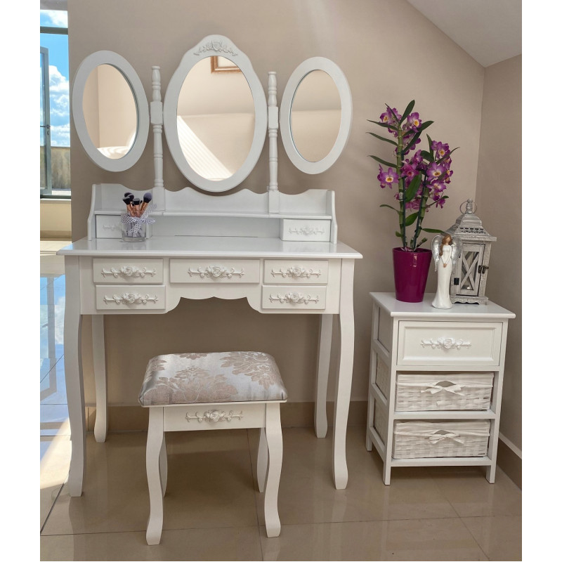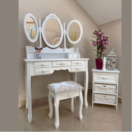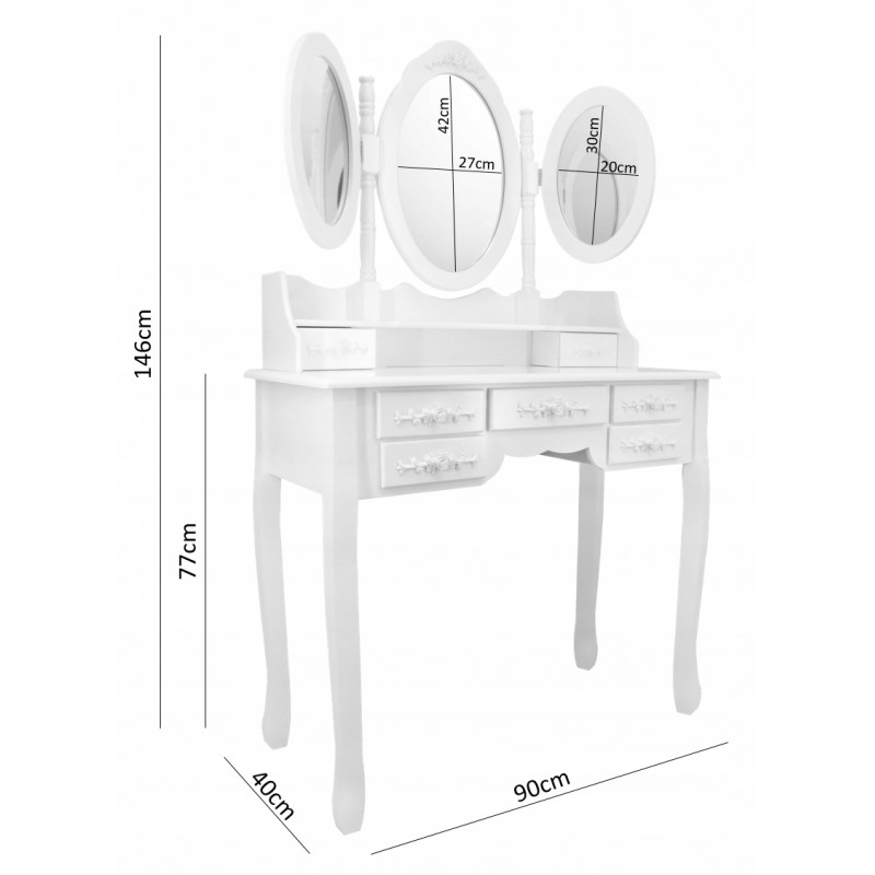 MASA DE TOALETA ALBA -VINTAGE- O masa de toaleta eleganta este visul majoritatii femeilor. Este o solutie functionala si practica. Ne permite sa ne depozitam cosmeticele sau bijuteriile preferate - o oglinda potrivita, comoditate in utilizare si confortul de a avea la indemana toate articolele necesare. Canelurile delicate il fac perfect pentru stilul vintage si shabby chic. Setul include, de asemenea, un taburet confortabil, tapitat cu un model floral, care va adauga farmec si eleganta incaperilor dvs. PARAMETRII: Oglinda mare + 2 oglinzi mai mici Stil de epoca Fabricat din placi de mobilier MDF7 sertare spatioase Decoratii delicate Scaun inclus Dimensiuni, asa cum se arata in imaginea de mai jos *Articolele prezentate in imagine (bijuterii, cosmetice) nu fac parte din masa de toaleta.