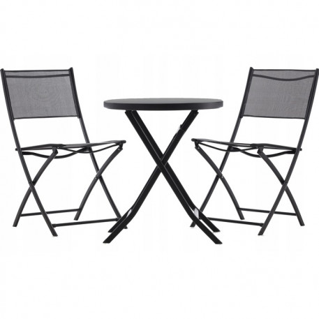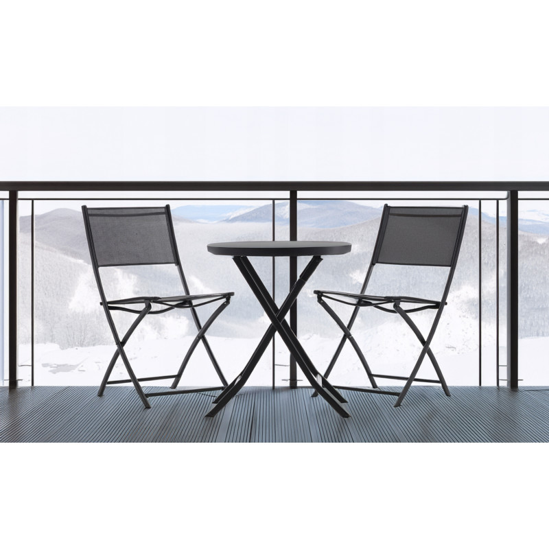 Scurta descriere Acest set de mobilier pliabil este alegerea ideala pentru spatii mici, precum balconul sau terasa. Masa cu blat din sticla securizata si cele doua scaune ergonomice din material textil ofera atat rezistenta, cat si confort. Structura metalica vopsita electrostatic asigura durabilitate si rezistenta la intemperii. Designul modern si functia pliabila transforma acest set intr-o solutie practica si eleganta.