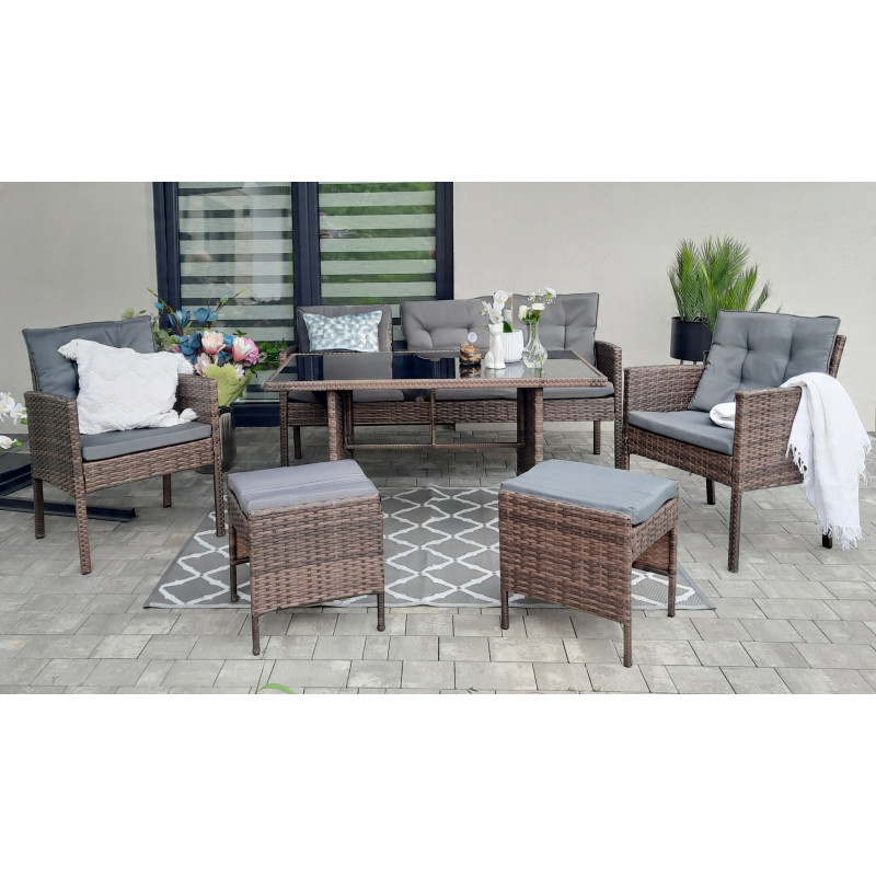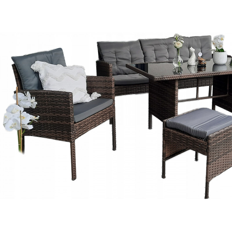 Scurta descriere Setul de mobilier pentru gradina este alegerea ideala pentru relaxare in aer liber sau chiar in interior. Designul modern si combinatia de culori maro si gri se potrivesc usor in orice decor. Structura din otel si rattanul sintetic asigura durabilitate, iar pernele confortabile ofera o experienta placuta in utilizare zilnica.