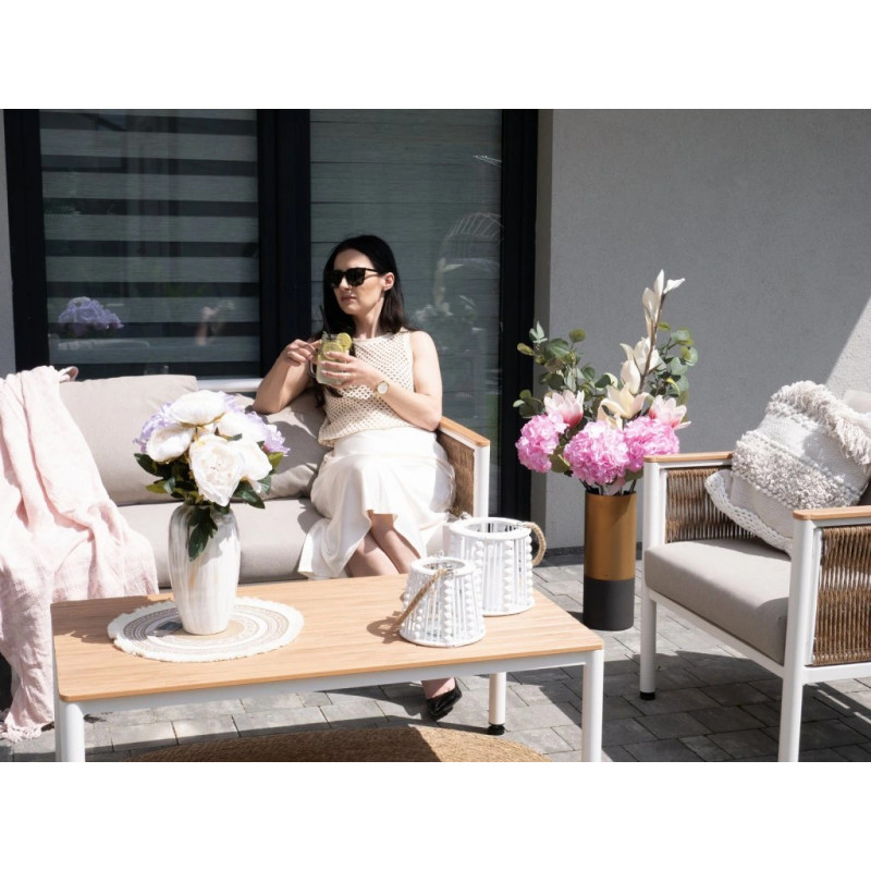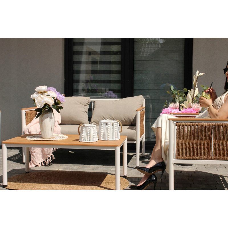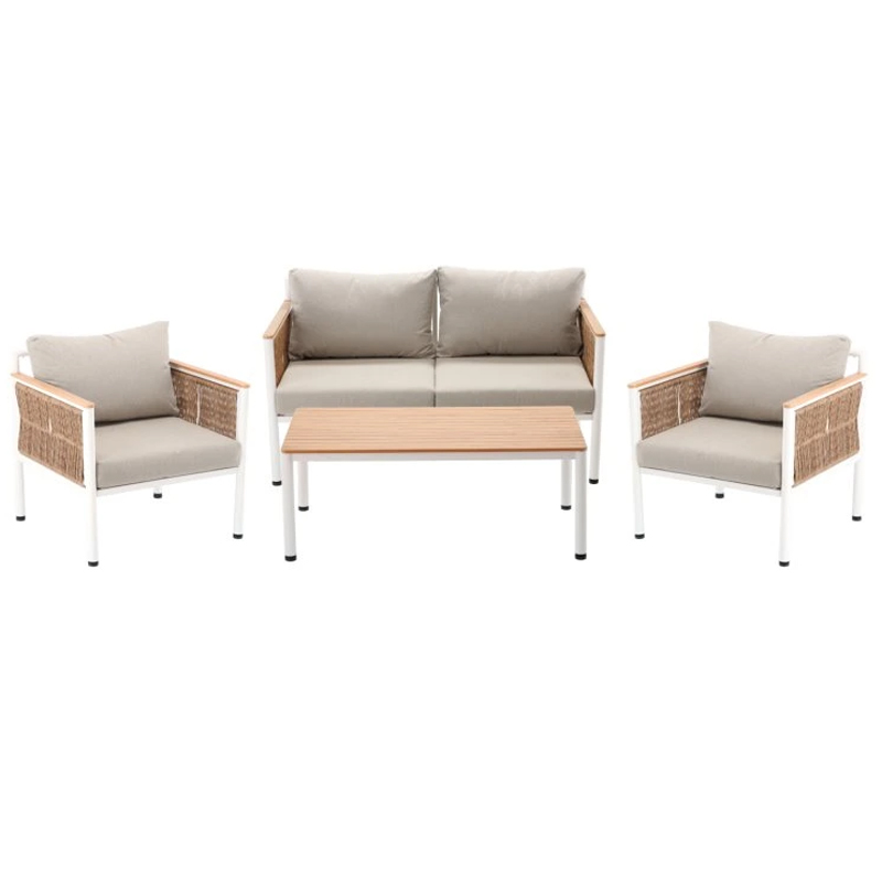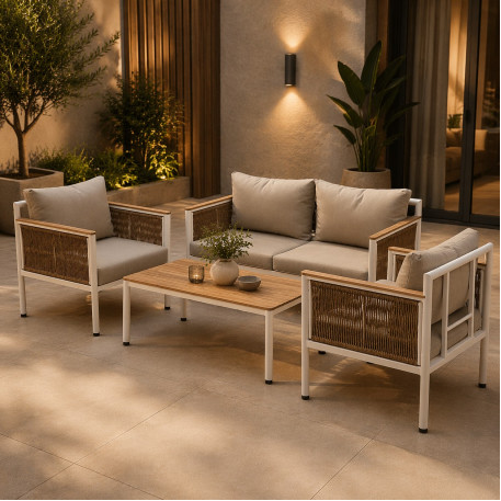 Scurta descriere Setul de mobilier Belgrad este alegerea ideala pentru amenajarea unui spatiu modern si relaxant in aer liber. Include o canapea pentru doua persoane, doua fotolii confortabile si o masa eleganta, fiind perfect pentru momentele petrecute pe terasa, balcon sau in gradina. Combinatia dintre aluminiu si materialul tip lemn ofera un aspect natural, dar cu rezistenta ridicata la exterior.