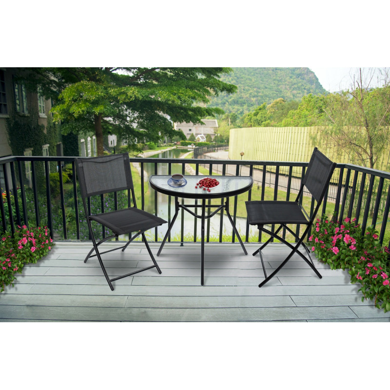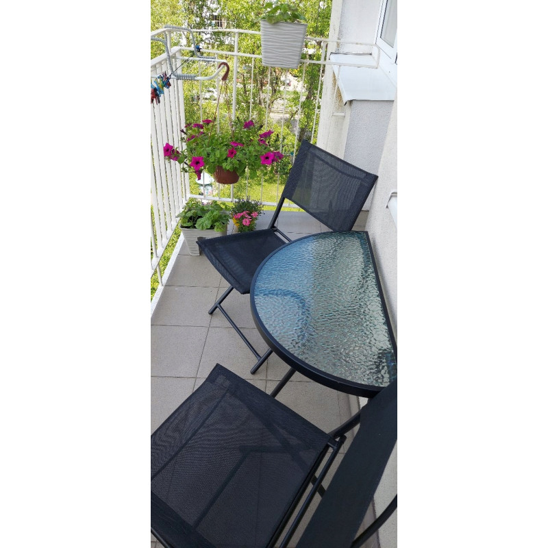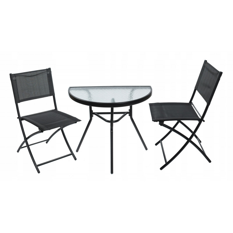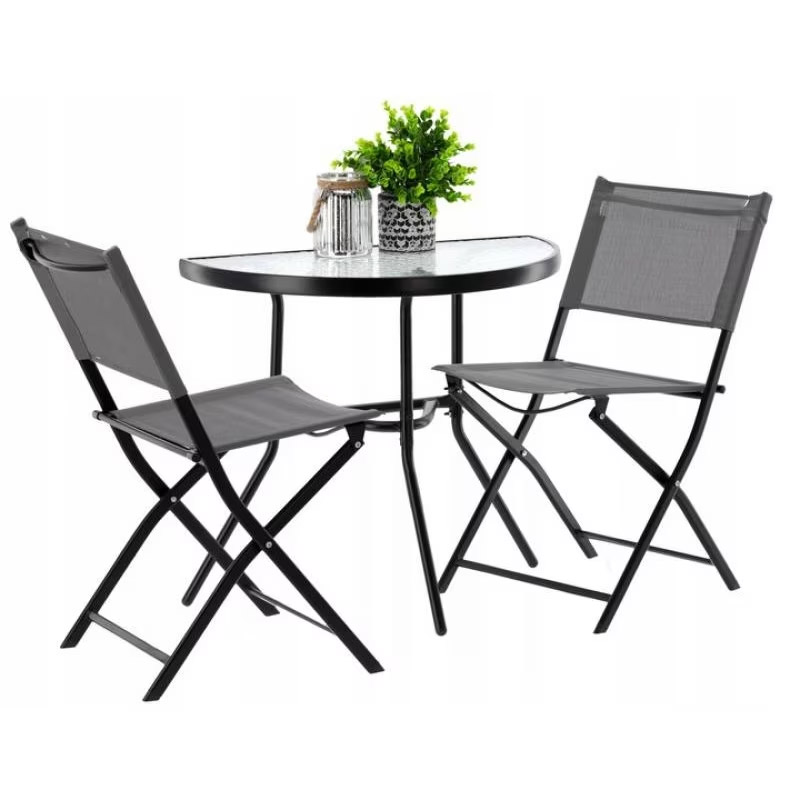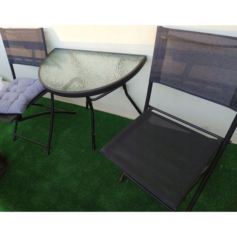 Setul de mobilier de gradina este ideal pentru cei care cauta o combinatie de clasic si elegant. Forma simpla si carourile elegante vor incanta pe toata lumea. Se potriveste in orice spatiu - pe balcon, pe terasa sau in gradina. Masa are sticla calita cu o textura de mozaic transparent va permite cu siguranta multi ani de utilizare. Scaunele au o constructie sudata care nu se zgarie, acoperita cu pulbere.Compozitia setului:1 x masa2 x scaun pliabil