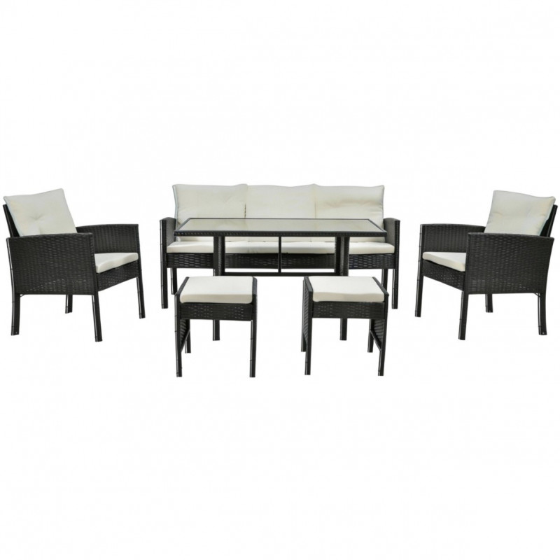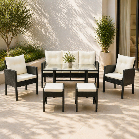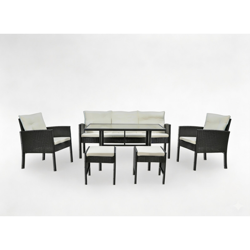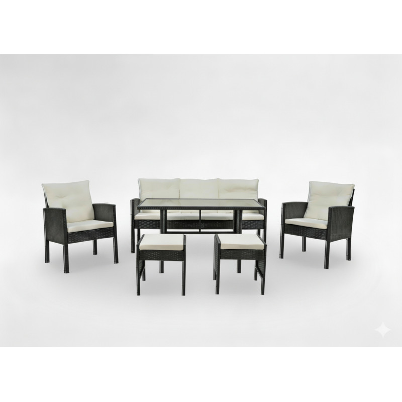 Scurta descriere Setul de mobilier Vaduz este alegerea ideala pentru amenajarea unui spatiu confortabil si elegant in gradina sau pe terasa. Include o canapea incapatoare, doua fotolii, doua pufuri si o masa practica, oferind suficient loc pentru relaxare in familie sau cu prietenii. Designul modern si materialele rezistente il fac potrivit atat pentru exterior, cat si pentru interior.