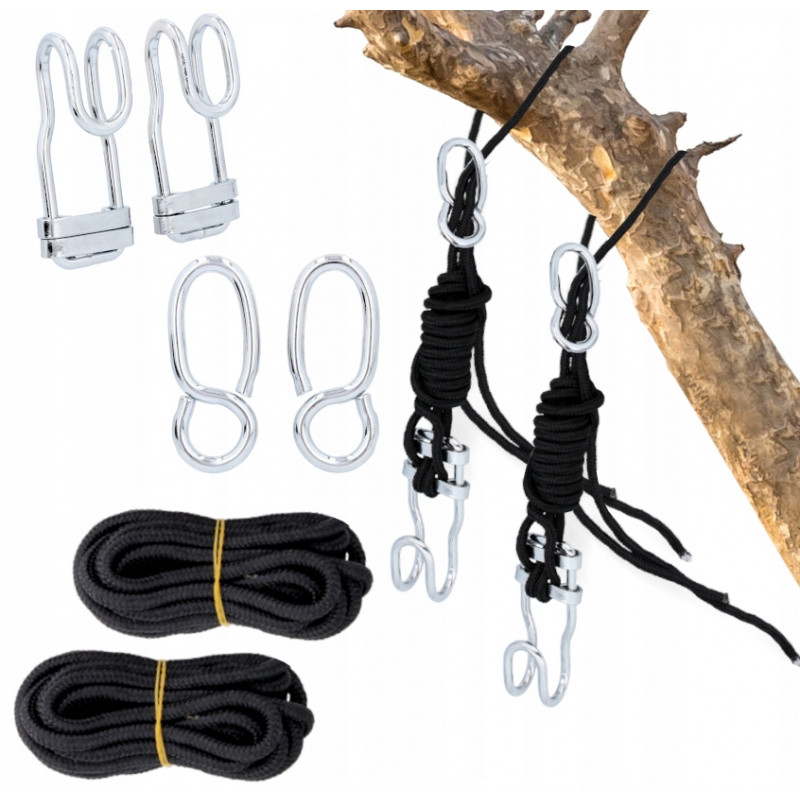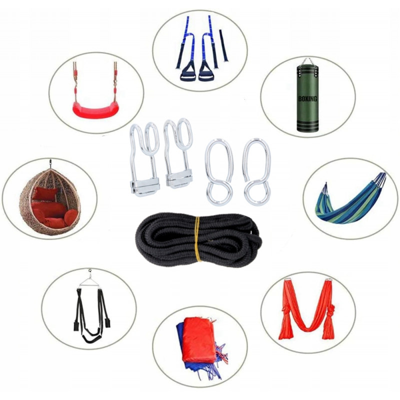 2 franghii de nailon: lungimea fiecarei franghii: 3,2 m2 carlige de fixare,2 carlige S.Capacitate de incarcare: 200 kg Otel inoxidabil, rezistenta la coroziune,Potrivit pentru instalare in interior si exterior.Usor de asamblat