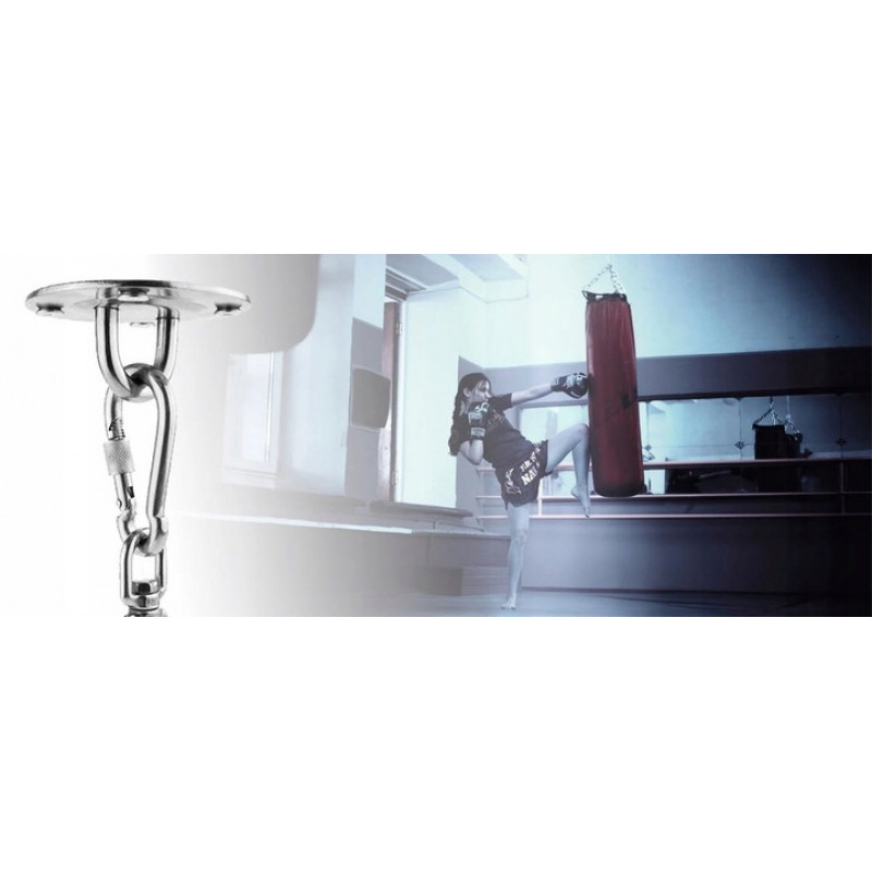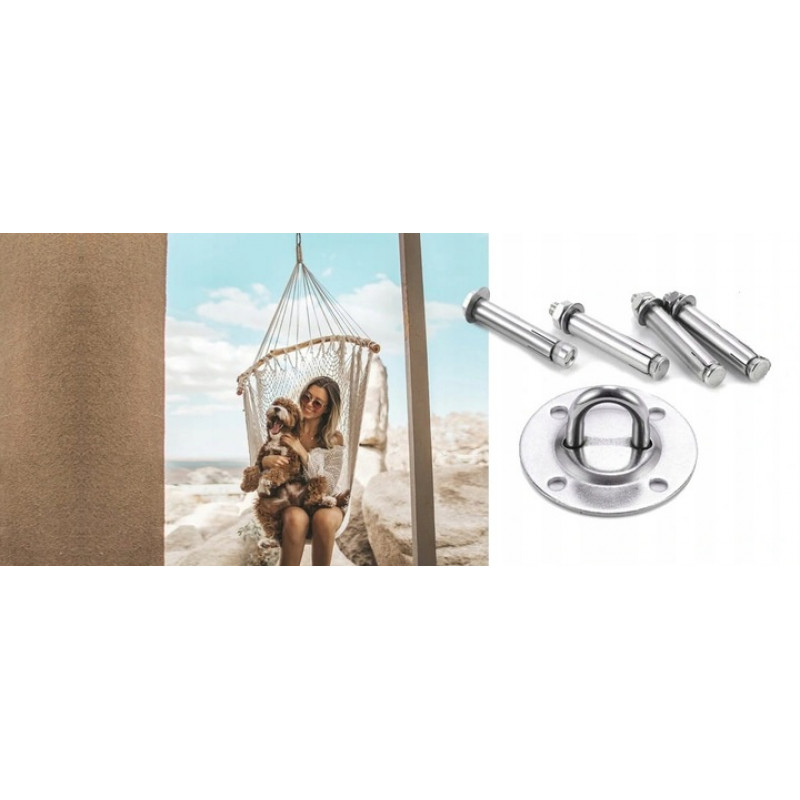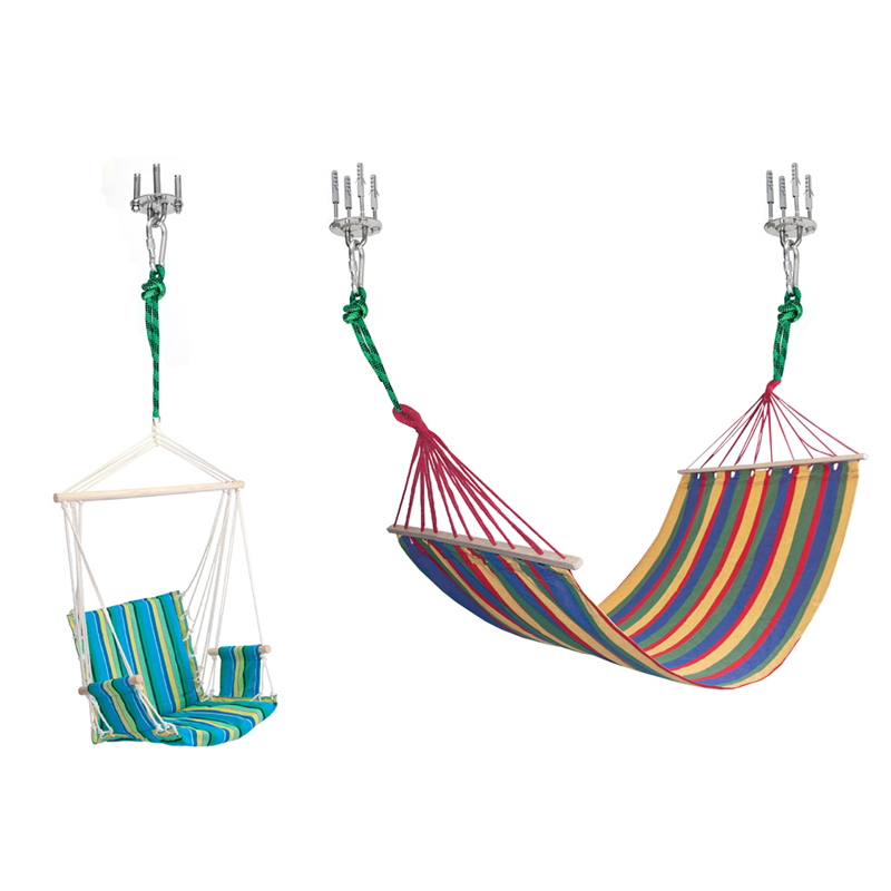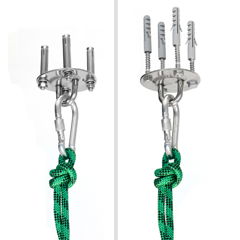 Asamblare simpla Set de montare universal pentru fixarea hamacelor, sezlongurilor, balansoarelor, a sacilor de box, a benzilor de exercitii si a multor alte dispozitive. Asigura o fixare stabila si astfel - siguranta in timpul utilizarii. Dispune de doua tipuri de suruburi - pentru suprafete de beton si de lemn, astfel incat sa puteti monta echipamentul dumneavoastra oriunde doriti! Setul este fabricat din metal solid si durabil. Carligul este echipat cu un sistem de eliberare rapida si un sistem de blocare impotriva detasarii bruste. Franghia solida din polipropilena va asigura o fixare ferma si, cu lungimea sa de 2 m, permite reglarea libera.