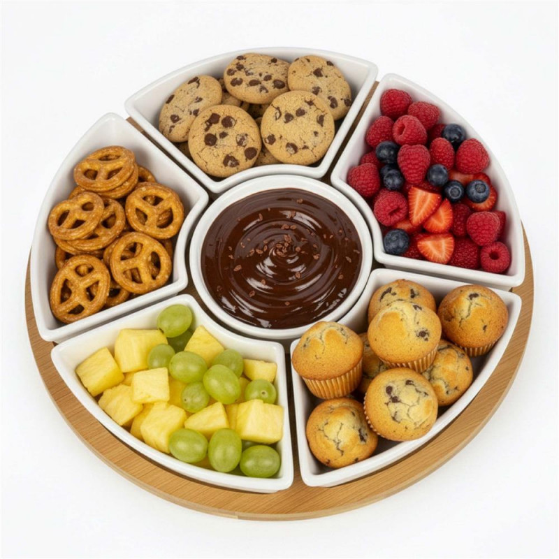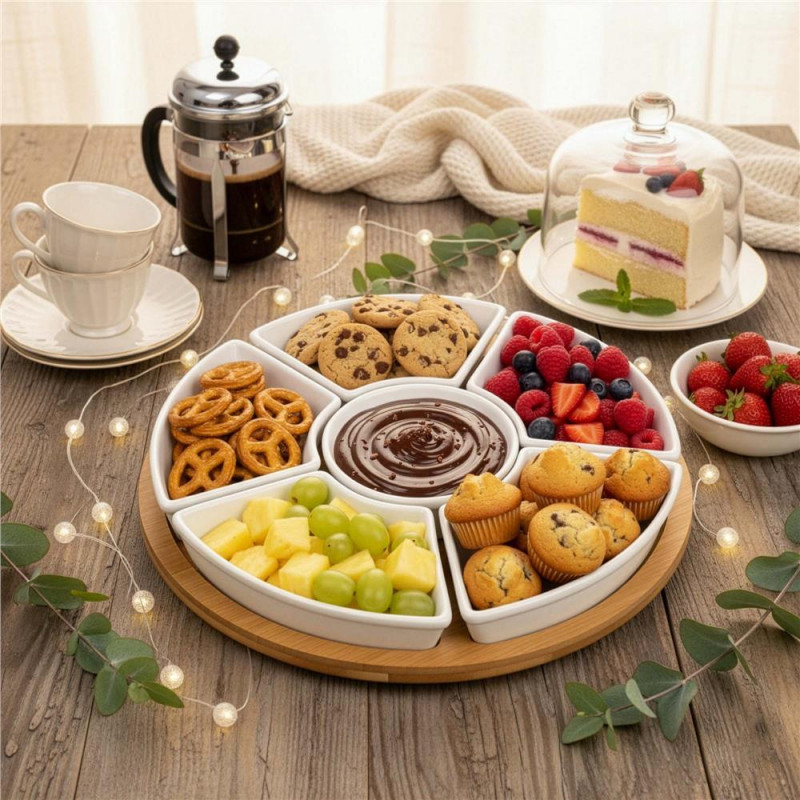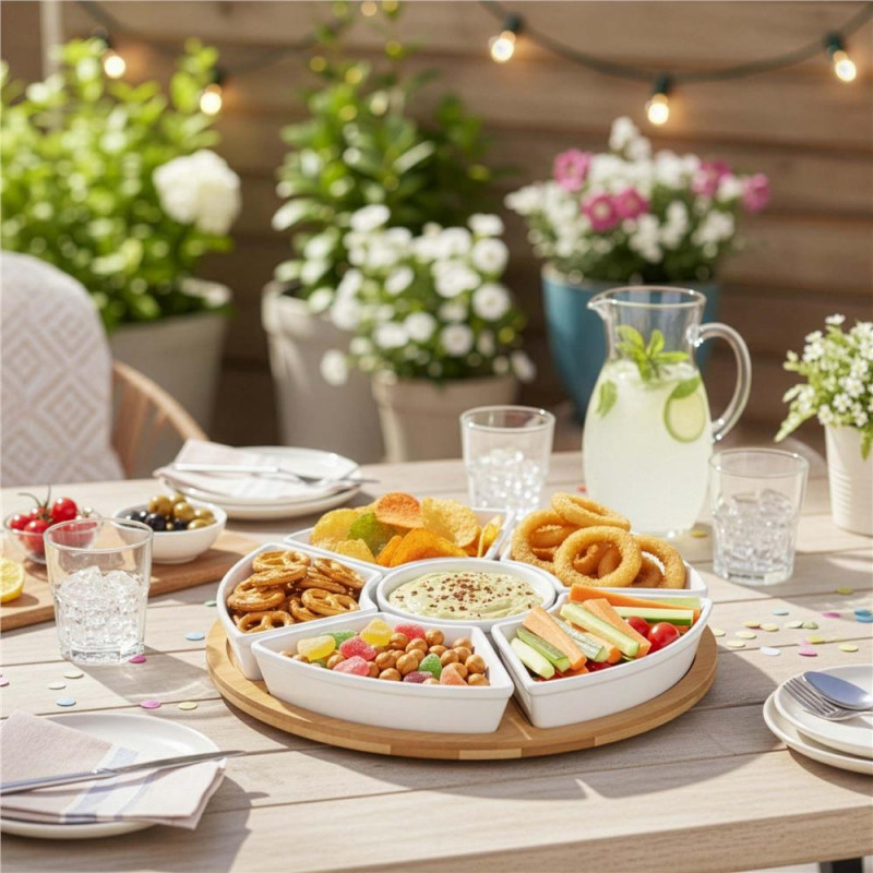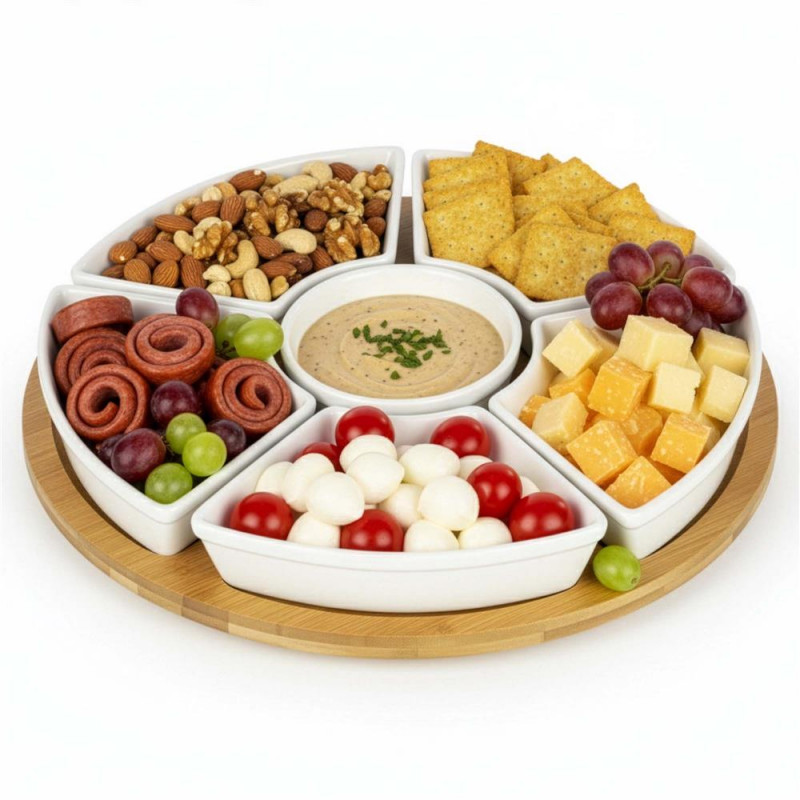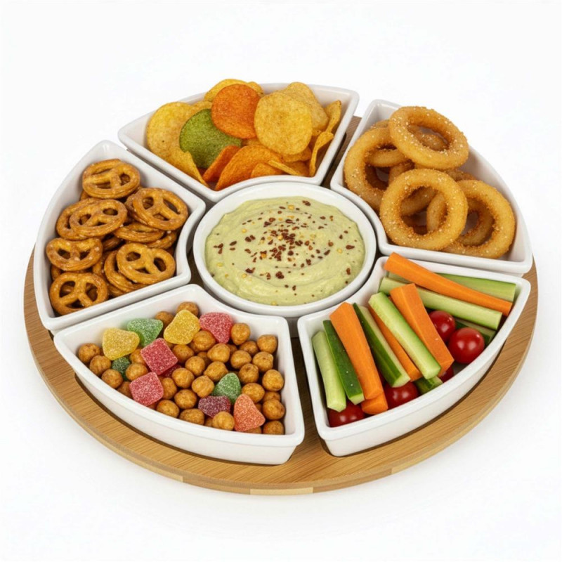 Scurta descriere: Setul rotativ pentru servirea aperitivelor este ideal pentru organizarea gustarilor intr-un mod elegant si practic. Platoul din bambus este prevazut cu mecanism rotativ 360°, iar bolurile din portelan permit servirea diferitelor tipuri de alimente, de la sosuri la snacks-uri.