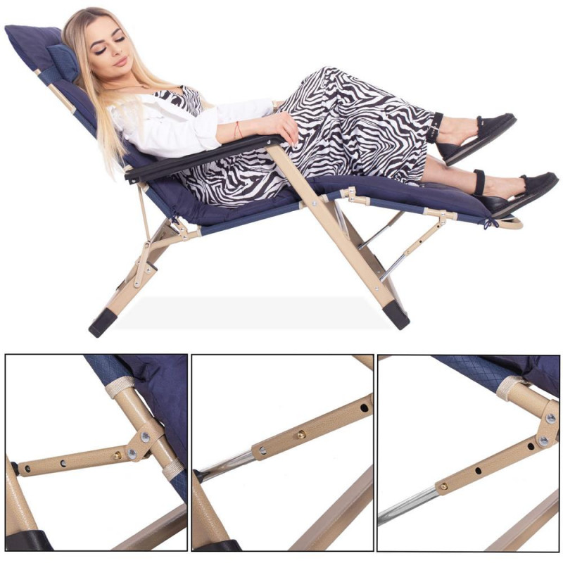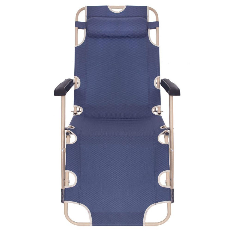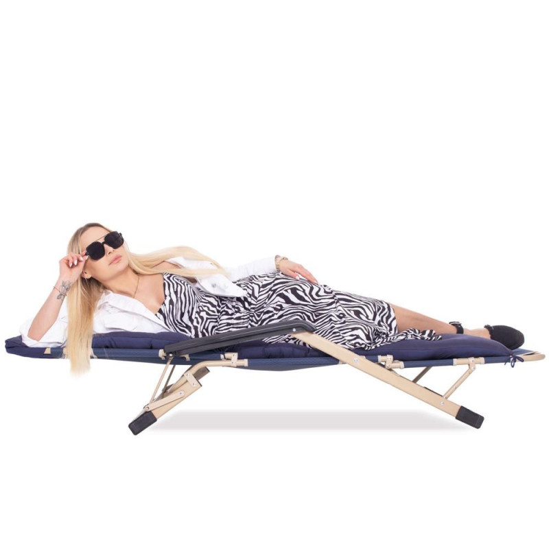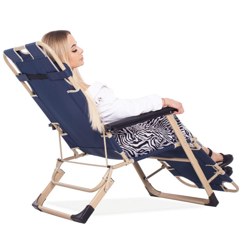 Tetiera ergonomica si moale Cotierele rotunjite asigura o pozitie de sedere confortabila. Pozitia reglabila a scaunului este perfecta pentru a te intinde in timp ce te relaxezi sau pentru a sta langa foc. Tetiera ergonomica sporeste cu siguranta confortul atunci cand faceti plaja. Este imposibil sa nu remarcam stilul vizual extrem de original al sezlongului nostru. Culorile sale unice si prezenta unei perne moi, matlasate o fac sa se potriveasca nu numai in aranjamentele moderne, ci si in stilurile retro si boho, dand un caracter confortabil spatiului terasei sau gradinii tale. Sezlongul se pliaza rapid si usor. Prin urmare, nu ocupa mult spatiu si poate astepta in siguranta urmatoarea vara intr-o camera sau intr-o zona acoperita. Cadrul a fost acoperit pentru a preveni rugina.