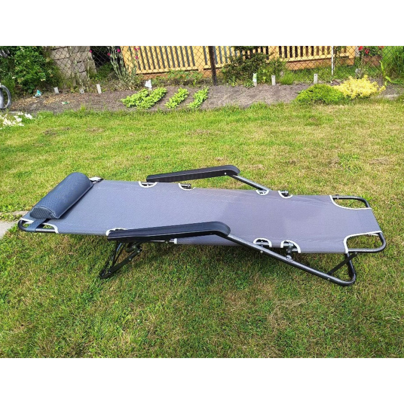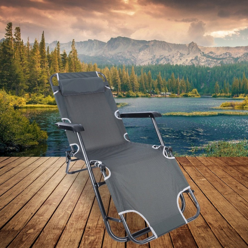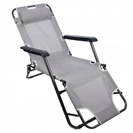Scurta descriere Sezlong pliabil, ideal pentru relaxare in gradina, pe balcon sau la plaja. Prevazut cu spatar reglabil in 3 pozitii si tetiera detasabila pentru confort sporit. Cadrul metalic rezistent si materialul usor de curatat il fac potrivit pentru utilizare frecventa in exterior.