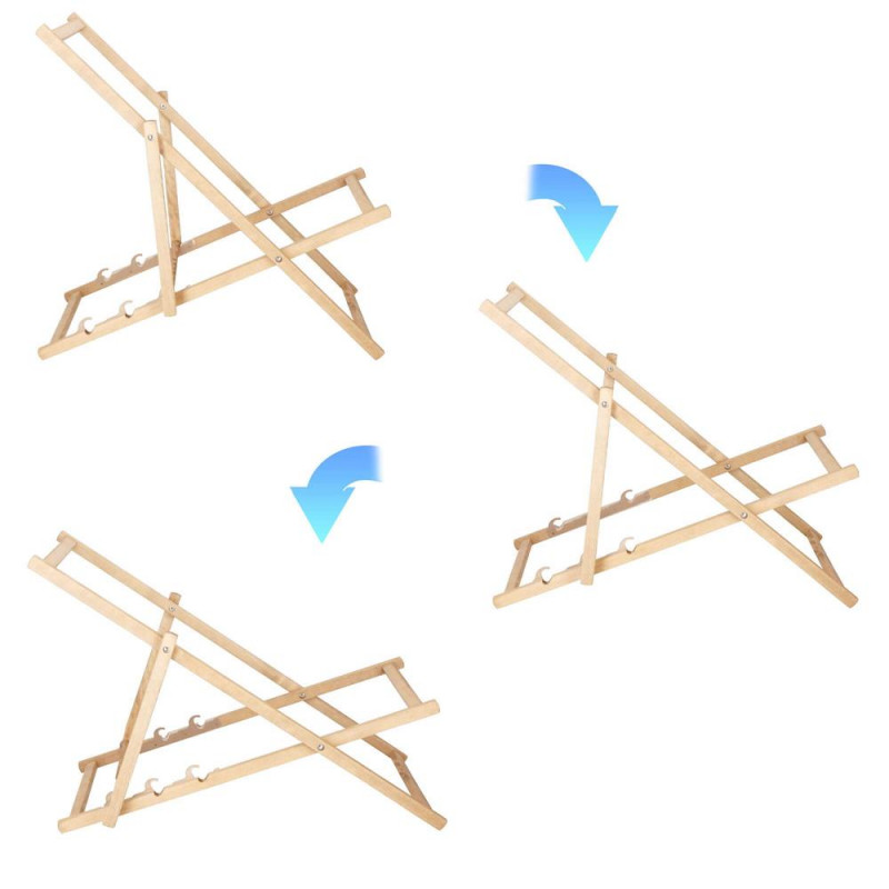 Bucurati-va de timpul liber cu scaunul nostru de gradina sau plaja! Scaunul pliant va reprezenta o achizitie extraordinara pentru gradina, terasa sau balconul dvs. Fiind pliabil si usor in greutate, este perfect pentru plaja si camping!Scaunul este alcatuit dintr-un cadru robust din lemn si o suprafata de sedere de inalta calitate, rezistenta la intemperii. In plus, scaunul de plaja poate fi ajustat in 3 setari de inclinare, pentru un confort optim. Acest sezlong pentru exterior poate fi pliat pentru a fi usor de transportat si depozitat, atunci cand nu este utilizat. Acest scaun de gradina necesita asamblare . Specificatii
