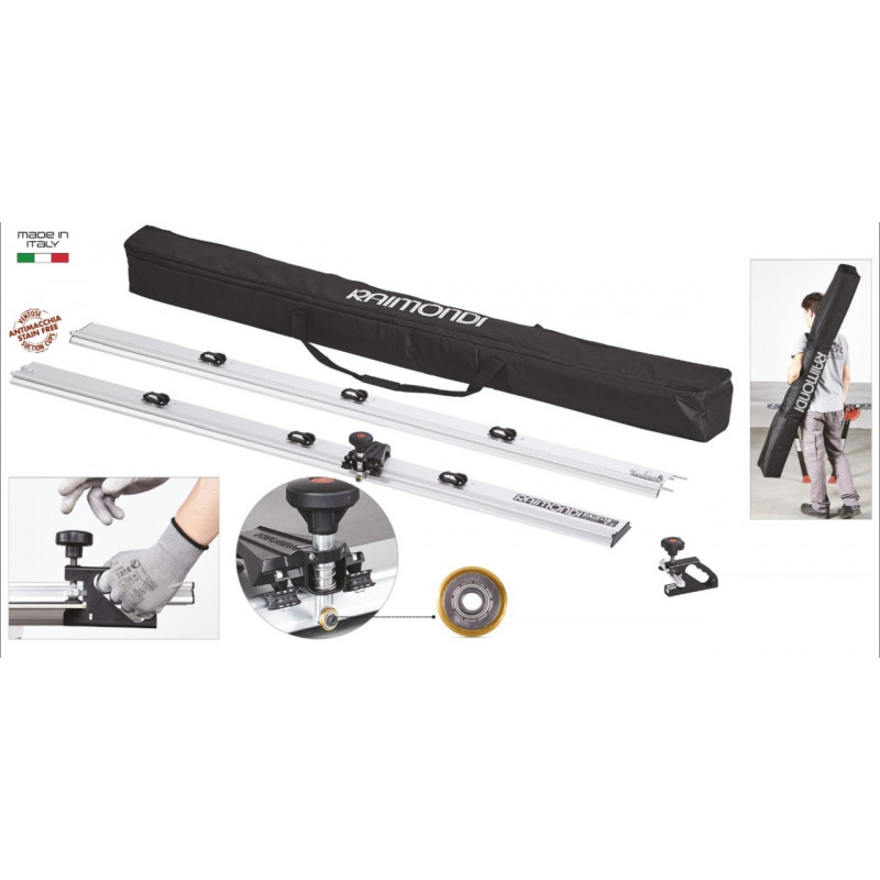 RAIZOR PLUS este un sistem profesional de tăiere cu șine, proiectat pentru incizarea și ruperea precisă și eficientă a plăcilor (dalelor) ceramice de format mare. Oferă o lungime standard de tăiere de până la 330cm și poate fi extins la 450 cm. Sistemul este compus din două șine conectabile, o unitate de tăiere din aluminiu turnat sub presiune, cu element de incizare cu arc, și o pereche de clești PREMIUM cu presiune progresivă. Șinele sunt concepute pentru o rigiditate structurală ridicată și sunt prevăzute cu șase ventuze cu buze duble în total, asigurând stabilitate chiar și pe suprafețe moderat texturate.