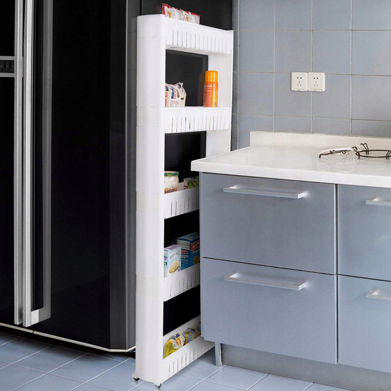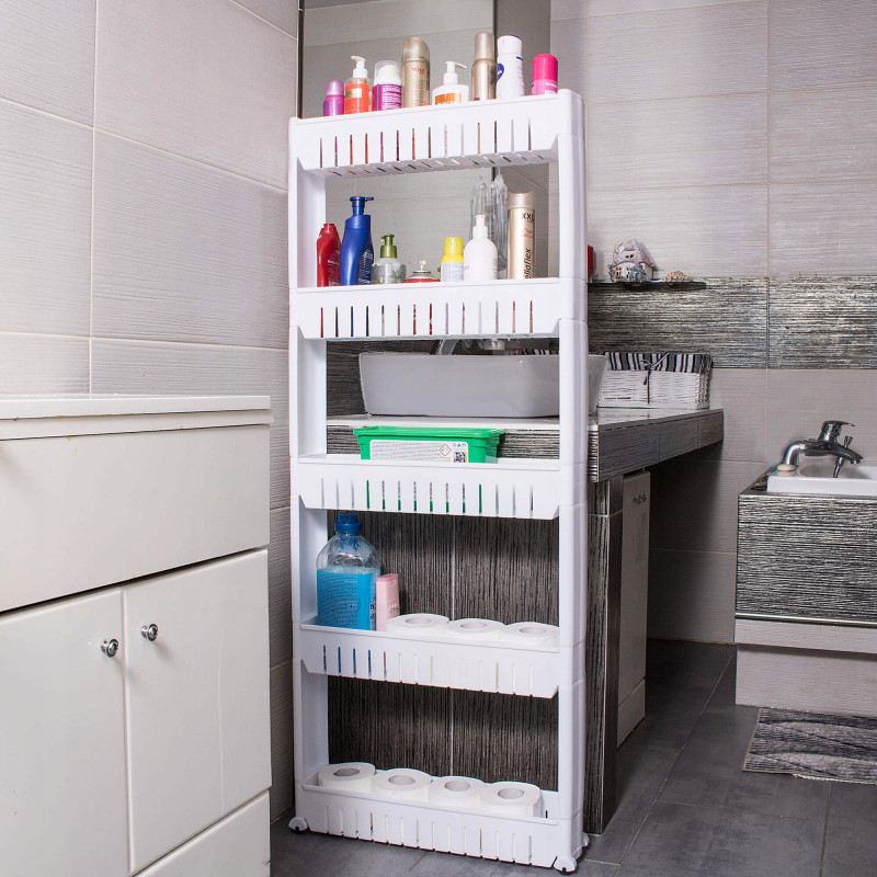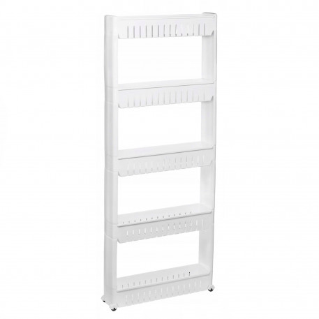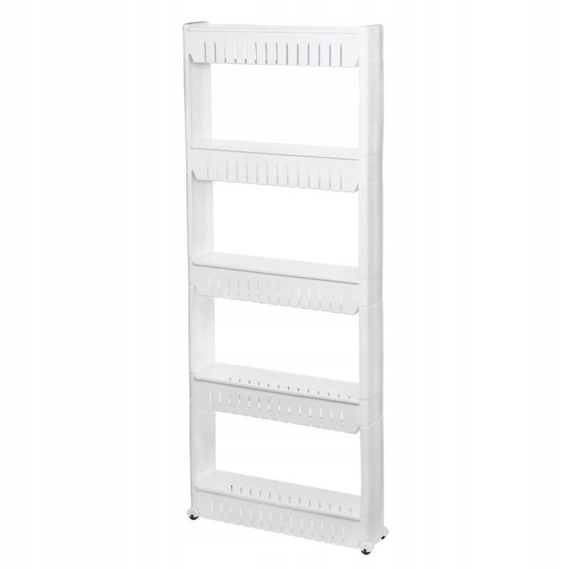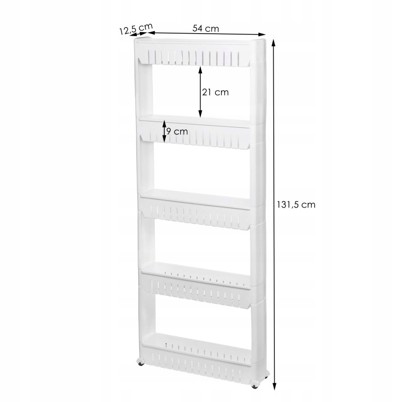 Adancime: aproximativ 12,5 cm Un dulap mobil pe roti va va ajuta sa utilizati spatii inguste in baie, bucatarie, camara sau alta camera. Cinci rafturi spatioase va asigura ca pastrati cele mai necesare lucruri in apropiere. Fabricat din materiale de cea mai buna calitate, durabil si rezistent la temperaturi ridicate, va servi foarte mult timp. Multifunctionalitate Rack-ul pe roti este perfect pentru multe intrebuintari. Va depozita produsele cosmetice, balsamul de rufe, detergentul de spalat sau o multime de alte lucruri. Pe de alta parte, in bucatarie, va fi minunat pentru amenajarea unui loc pentru bauturi sau alte produse alimentare. Asezandu-l in camera unui copil, acesta se va potrivi animalelor de plus si alte jucarii pe rafturi. Datorita functionalitatii multiple a acestui dulap, puteti decide singur unde va va ajuta sa gestionati practic un spatiu ingust. Utilizare confortabila Patru roti faciliteaza mutarea raftului. Datorita acestui fapt, schimbarea locului este foarte usoara. In plus, plierea si demontarea acestuia sunt intuitive. Pentru a-l putea folosi, este suficient sa-l pliati in trei pasi. Spatiu suplimentar utilizabil Datorita utilizarii unui raft mobil, puteti castiga spatiu suplimentar intr-un loc ingust, de exemplu intre un frigider si un dulap sau intre o masina de spalat si un perete. Acesta va gazdui multe lucruri care sunt necesare in fiecare zi.