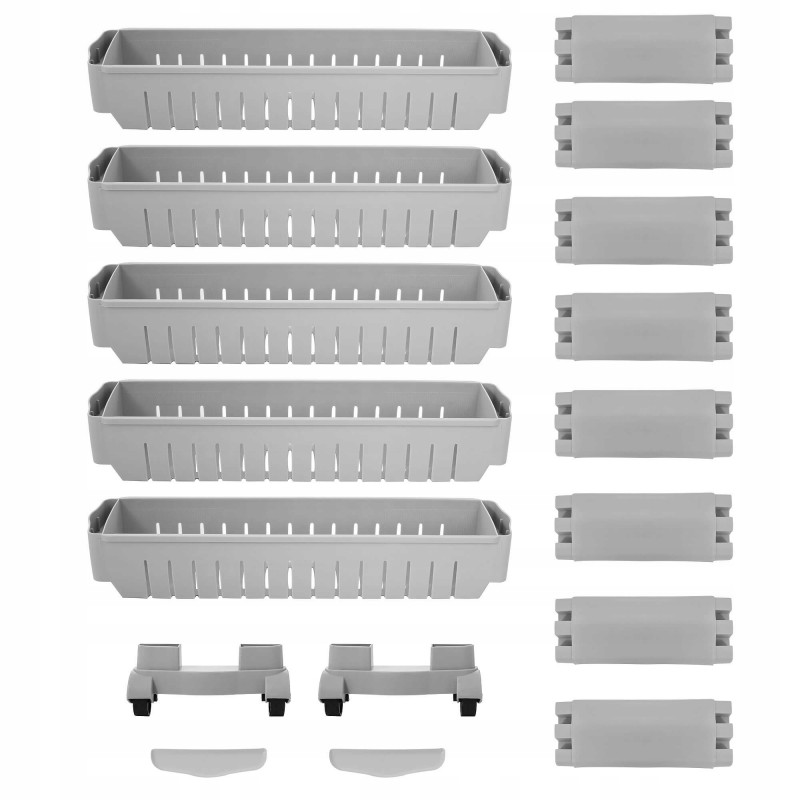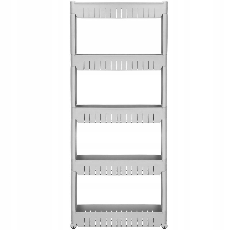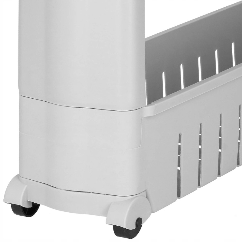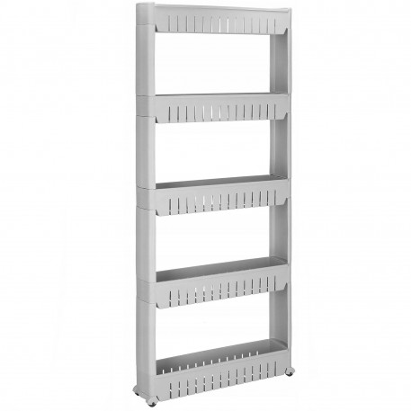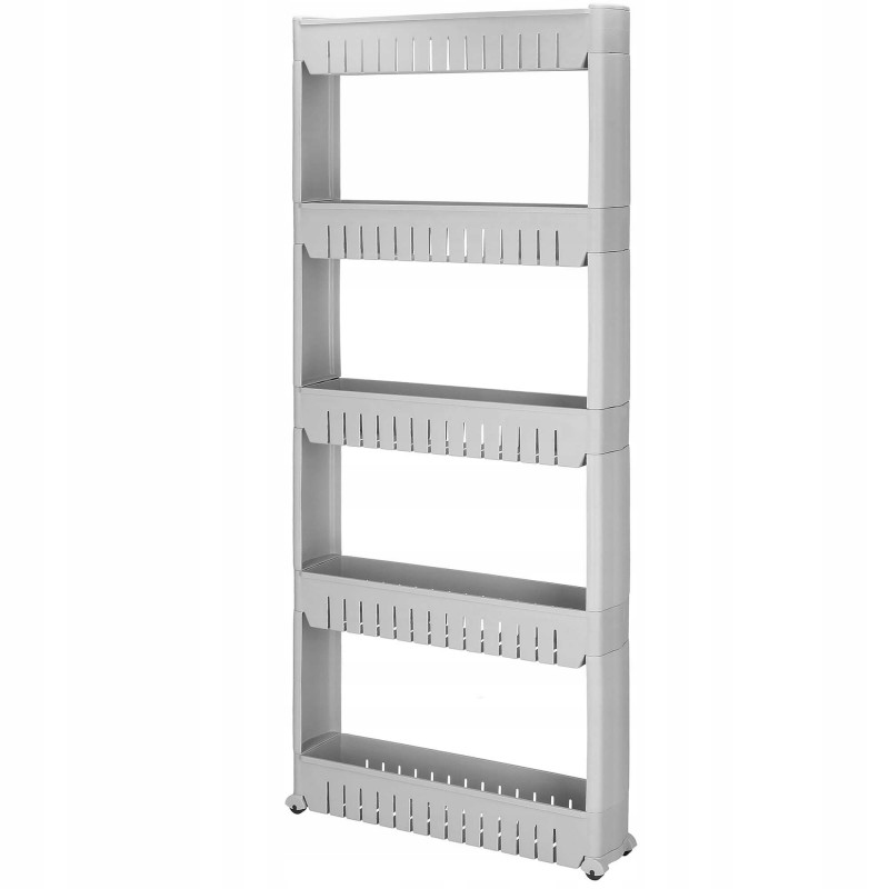 Adancime: aproximativ 12,5 cm Un dulap mobil pe roti va va ajuta sa utilizati spatii inguste in baie, bucatarie, camara sau alta camera. Cinci rafturi spatioase va asigura ca pastrati cele mai necesare lucruri in apropiere. Fabricat din materiale de cea mai buna calitate, durabil si rezistent la temperaturi ridicate, va servi foarte mult timp. Multifunctionalitate Rack-ul pe roti este perfect pentru multe intrebuintari. Va depozita produsele cosmetice, balsamul de rufe, detergentul de spalat sau o multime de alte lucruri. Pe de alta parte, in bucatarie, va fi minunat pentru amenajarea unui loc pentru bauturi sau alte produse alimentare. Asezandu-l in camera unui copil, acesta se va potrivi animalelor de plus si alte jucarii pe rafturi. Datorita functionalitatii multiple a acestui dulap, puteti decide singur unde va va ajuta sa gestionati practic un spatiu ingust. Utilizare confortabila Patru roti faciliteaza mutarea raftului. Datorita acestui fapt, schimbarea locului este foarte usoara. In plus, plierea si demontarea acestuia sunt intuitive. Pentru a-l putea folosi, este suficient sa-l pliati in trei pasi. Spatiu suplimentar utilizabil Datorita utilizarii unui raft mobil, puteti castiga spatiu suplimentar intr-un loc ingust, de exemplu intre un frigider si un dulap sau intre o masina de spalat si un perete. Acesta va gazdui multe lucruri care sunt necesare in fiecare zi.