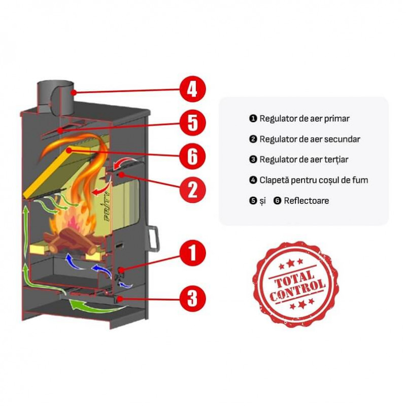 terțiar) și clapetă de tiraj pentru un consum eficient de combustibil.